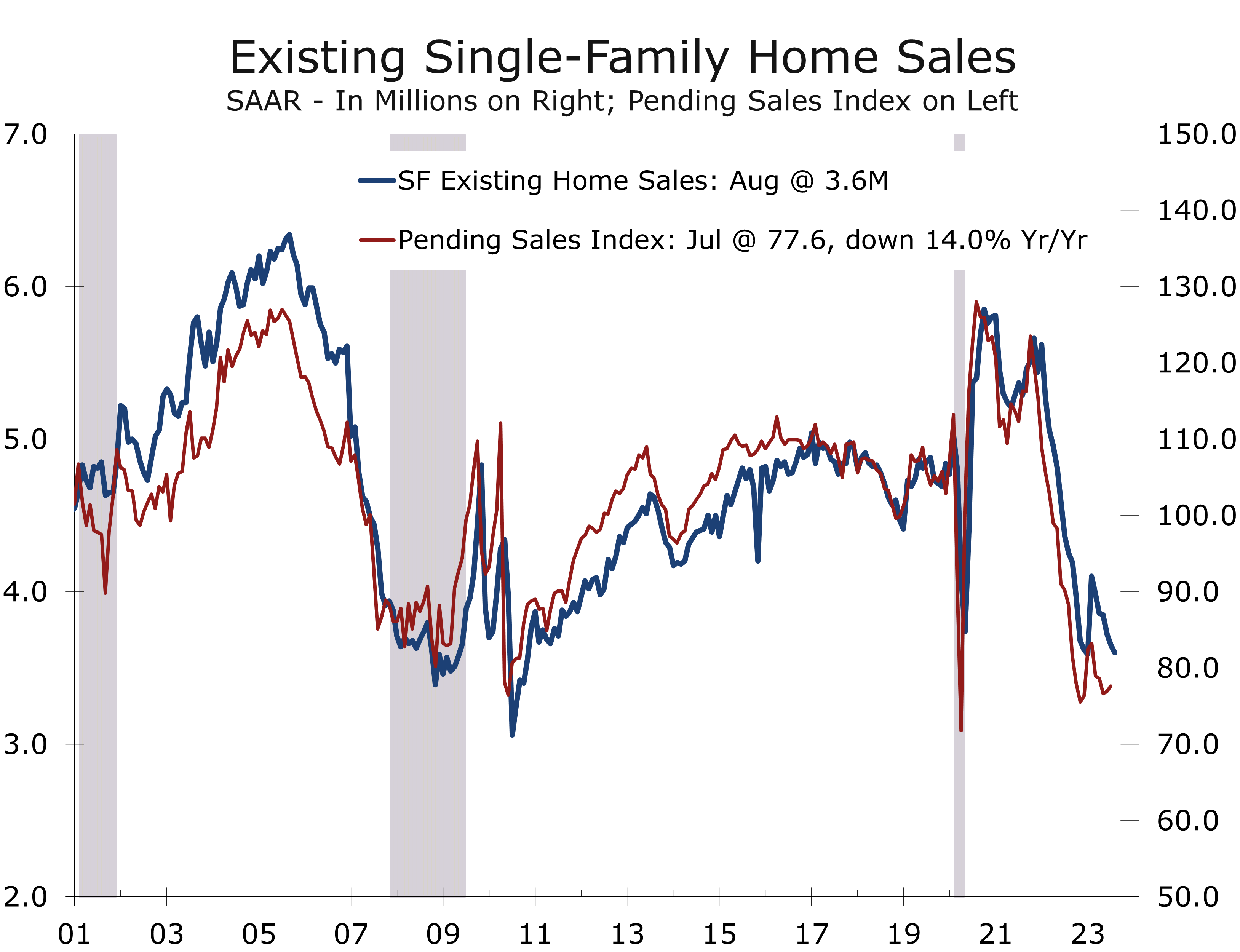 • Existing home sales continue to trend lower, as buyers continue to bid up prices amidst exceptionally low for-sale inventory. Sales closed in August were put under contract in June and July, when mortgage rates were a quarter percentage point lower than today.