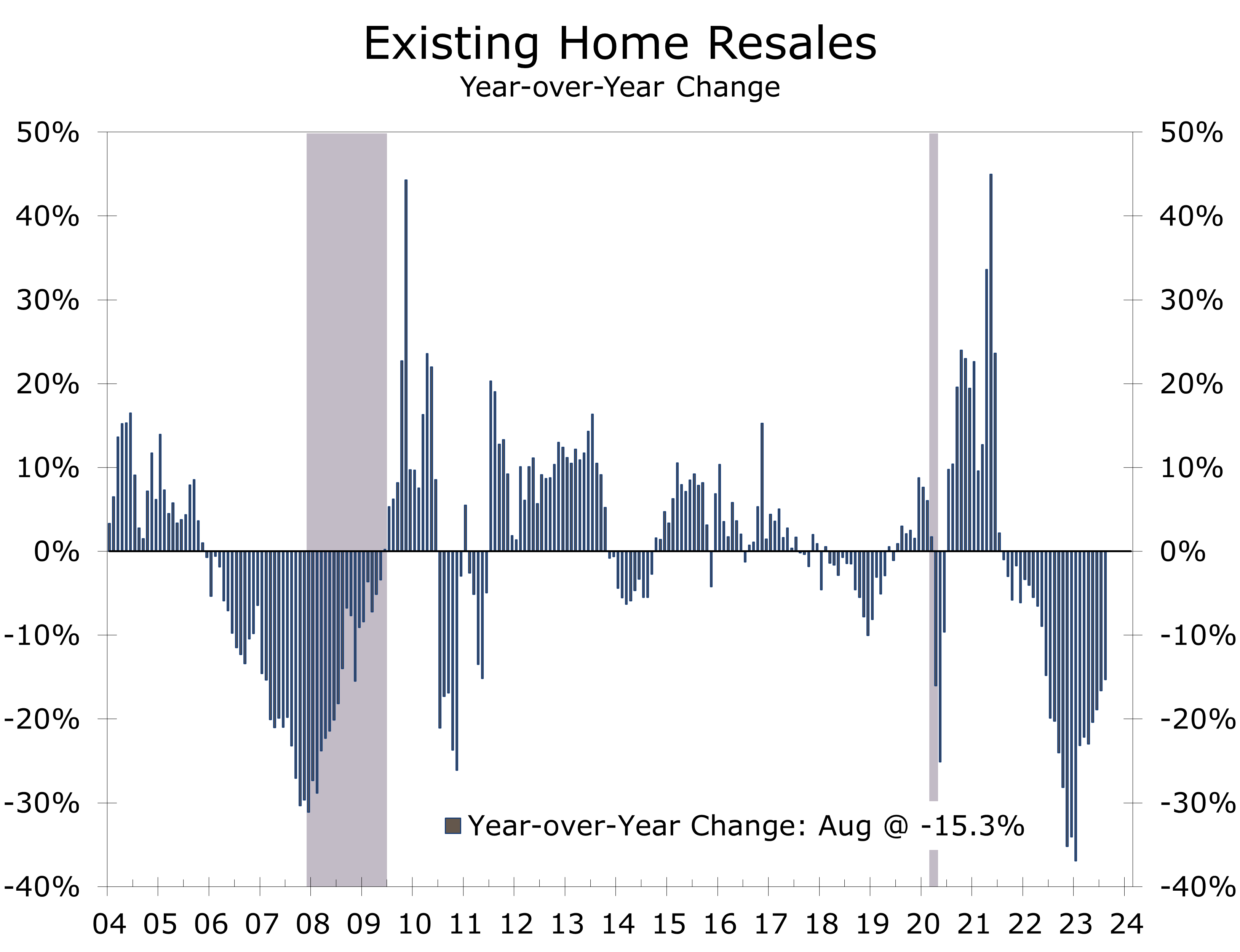 Existing home sales continued to trend lower in August, with overall sales declining 0.7% to a 4.04 million unit pace. Sales have fallen 15.3% over the past year and have declined year-to-year for the past 25 months. Overall sales are down a cumulative 38.4% since peaking in January 2021.