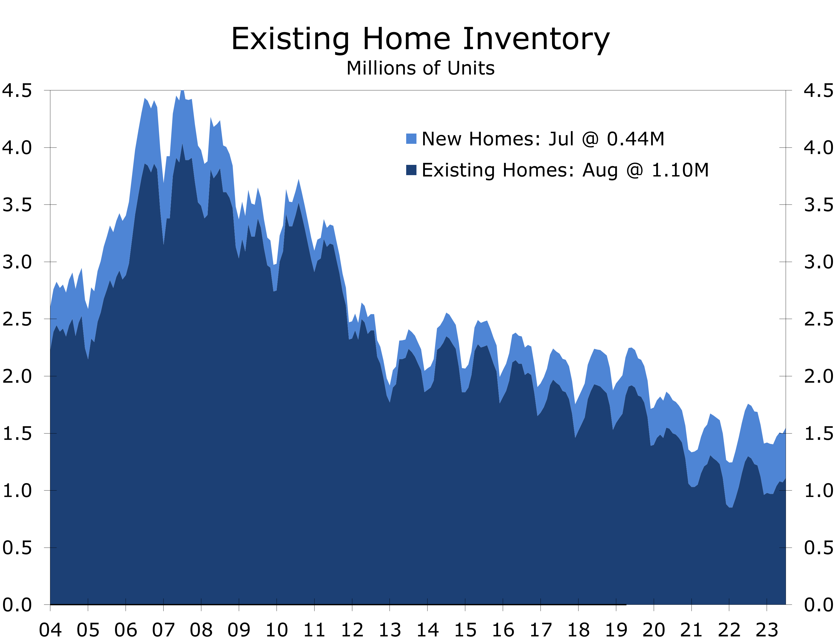 Sales have shown signs of stabilizing in recent months. Pending home sales rose 0.9% in July following a 0.4% rise in June. Those gains raised hopes existing home sales would perk up in August and September. The lag between purchase contracts and closings is typically around 6 weeks. This past month’s drop in existing home sales was the smallest monthly drop of any of the 17 declines since the persistent slide in existing home sales began back in February 2022.