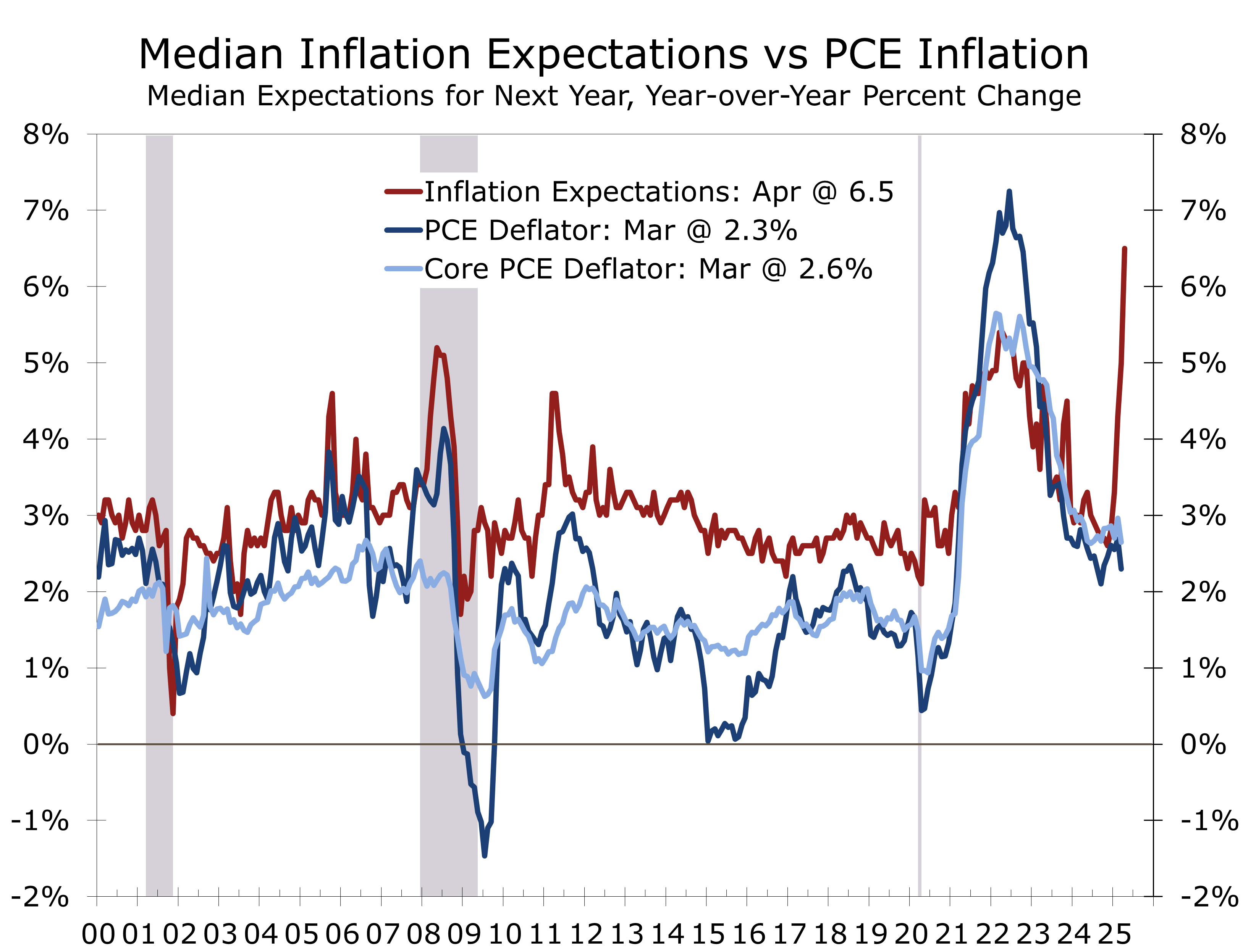 Tariffs have led to a spike in inflation expectations that might become a self-fulfilling reality. While market-based measures remain stable, surveys from the University of Michigan and the Conference Board have surged. Worries about tariffs might cause consumers to pull purchases forward and drive prices higher.