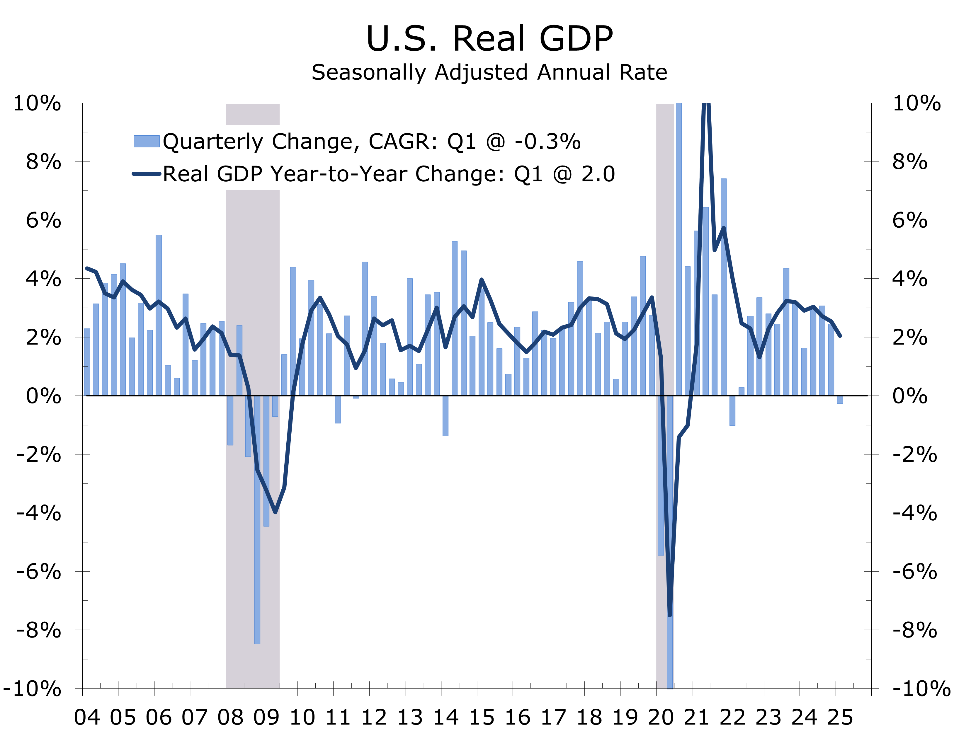 - Real GDP declined at a -0.3% annual rate in Q1, in line with expectations for a modest contraction.