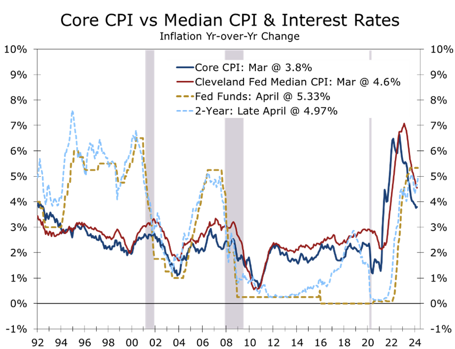 While 2% inflation may be a way off, the Fed should still be able to lower interest rates. The core PCE deflator – the Fed’s preferred price measure — topped out two years ago at 5.5% and has risen just 2.9% over the past year. As we have pointed out previously, however, the core prices measures, which exclude only food and energy prices, provide an exaggerated view on how fast inflation has come down due to the enormous swings in prices for a handful of items, including new and used light vehicles, health care, and residential rent. This is why we prefer measures such as the Cleveland Fed median CPI or trimmed mean CPI, which provide a better indication of how inflation is moderating in an overall sense. The direction and timing is roughly the same, but the magnitude of improvement has been much less by these more accurate measures.