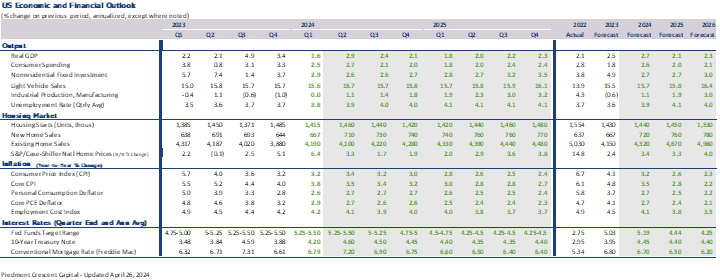 Views on the economy have changed considerably over the past month. Economic growth has proven stronger than expected, while inflation remains too high and has proven more persistent. Attitudes hardened following a larger than expected increase in the Consumer Price Index for March, which saw both the headline and core CPI rise 0.4% and marked the third consecutive higher-than-expected CPI report. Many forecasters either pushed out the timing when they believed the Fed would begin to cut interest rates or removed any cuts from this year entirely. We still believe the Fed will cut the federal funds rate twice this year, with the first quarter-point cut coming in September and a second coming at the December FOMC meeting.