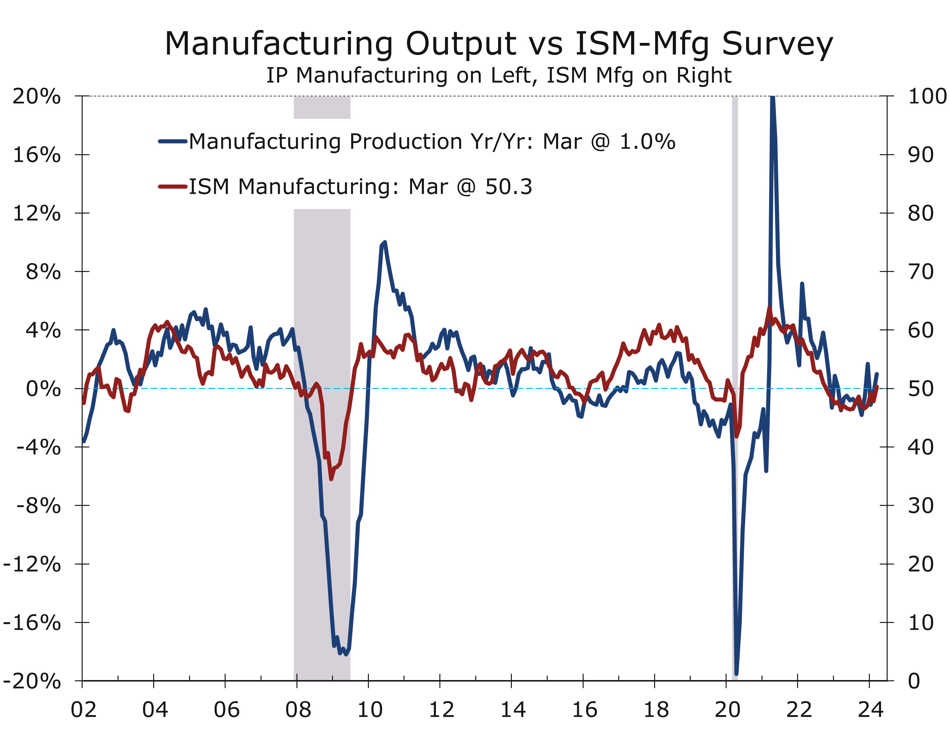 We may be on the verge of a resurgence in manufacturing along the line we saw in the latter part of the last decade. The ISM-Manufacturing Index, which tracks the breadth of the strength or weakness in the factory sector, rose back to 50.3 in March, marking its first reading above the key 50 break-even level since September 2022. The recent improvement in the ISM index was driven by increases in production and new orders. Customer inventories are also reported to be low, which means orders and output will likely rise further. Manufacturing employment, however, will take longer to improve.
