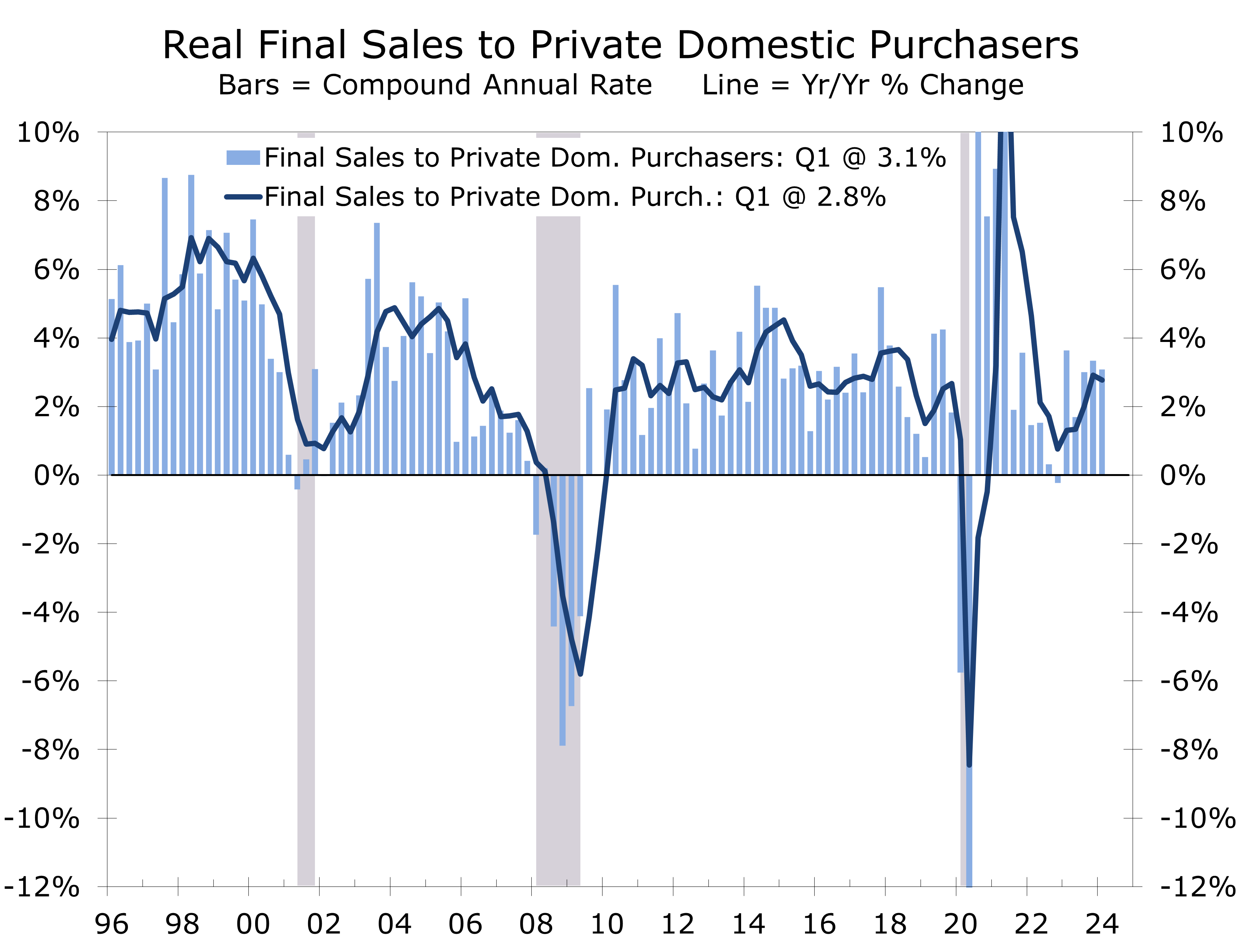 • While slower headline GDP growth is consistent with a soft landing, the financial markets are focused more intently on the continuing inflation The GDP deflator rose at a 3.1% pace in the first quarter, up from a 1.9% pace in the prior quarter. The PCE deflator rose at a 3.4% pace, while the core PCE deflator rose at a3.7% pace, up from 1.8% and 2.0% in Q4, respectively.