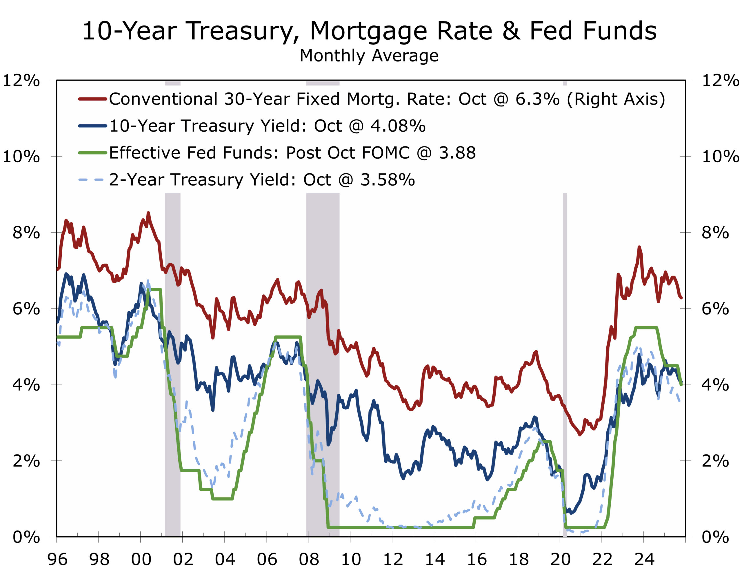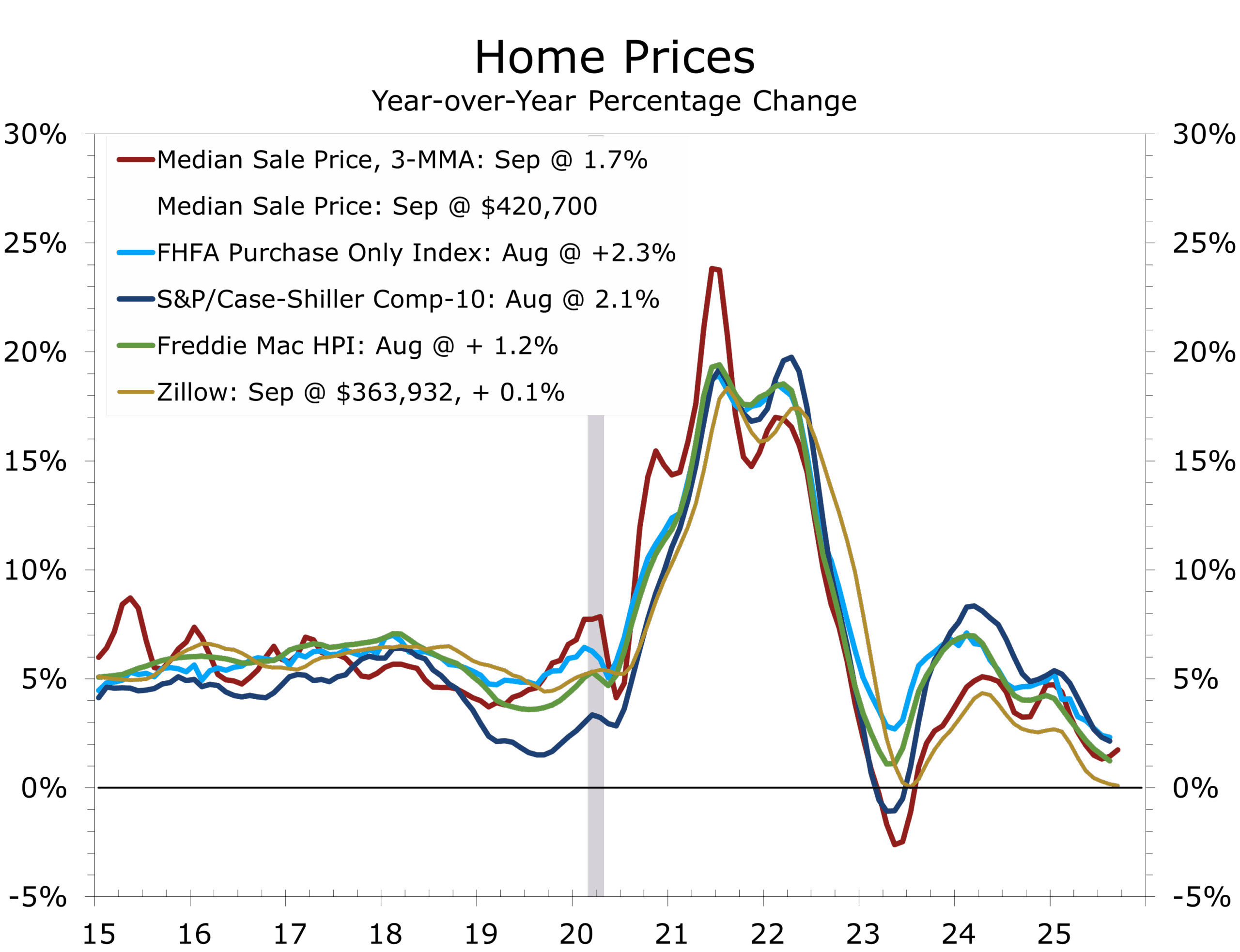 Housing is showing tentative signs of revival. The Case-Shiller index rose 0.2% in August — its first monthly gain since winter — as inventories normalized and sellers re-entered the market. Price growth has slowed to 1½% y/y but appears stable through year-end.