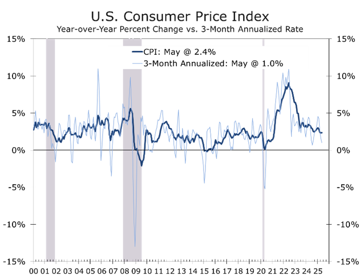May’s CPI and PPI prints once again surprised on the soft side—headline and core CPI rose +0.1% m/m; and the headline PPI matched that pace, with core goods prices declining. Businesses are apparently absorbing tariffs or deferring their impact by relying on previously source goods, especially in new motor vehicles and apparel. The core CPI has risen at just a 1.7% annualized pace over three months, while falling energy prices and smaller price hikes at the grocery store have held the overall CPI to just a 1% pace. This has allowed real wages to eke out modest gains, supporting consumer spending.