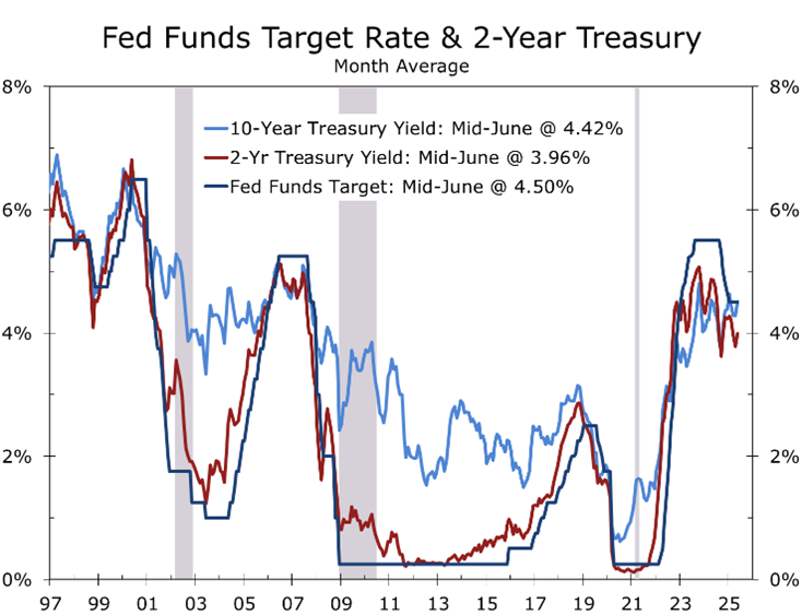 - Inflation trends and the volatile policy/geopolitical environment support the Fed’s pause. The labor market is cooling, however, and the balance of risks is shifting as inflation undershoots expectations. The Israel–Iran conflict has recalibrated global risks, with global growth likely to decelerate further.