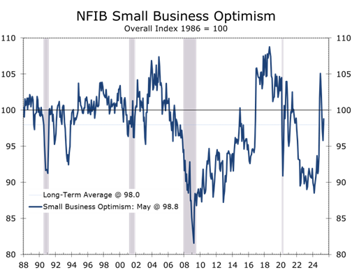 NFIB small business optimism rose to 98.8 in May—its first increase in six months—as sales expectations improved. Owners remain frustrated by the lack of progress on tax and regulatory relief and are struggling to absorb tariff-related cost increases. Capital spending plans are muted, with policy uncertainty delaying investment. Survey results align with ISM and factory orders data showing flat demand and persistently weak exports.