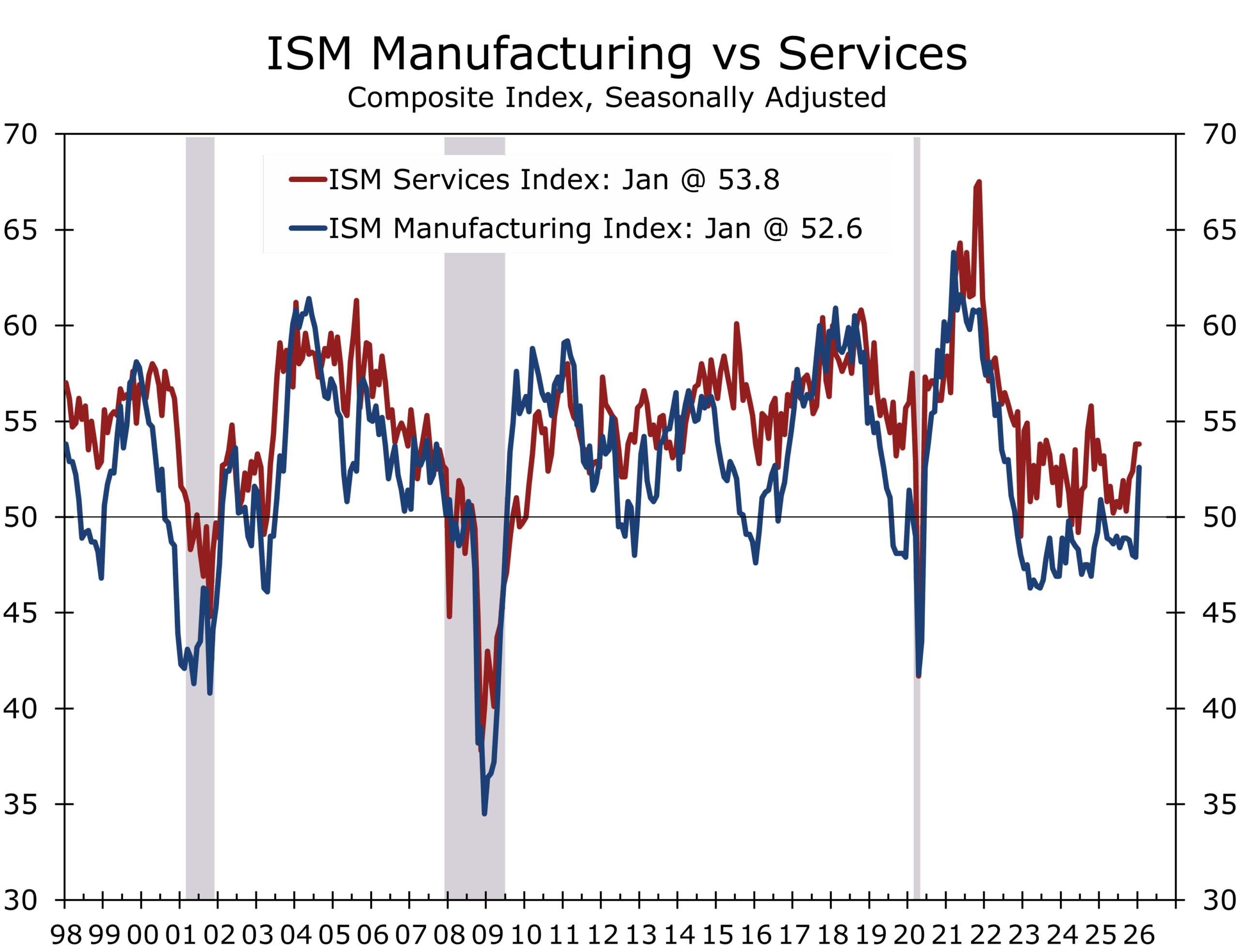The ISM Manufacturing Index surprised decisively to the upside, jumping 4.7 points to 52.6, its best reading in roughly three years. While activity is now back above the key 50 threshold separating expansion from contraction, the internal composition was notably stronger. New orders and production improved, supplier delivery times lengthened modestly, prices paid remained contained, and inventories stayed lean.