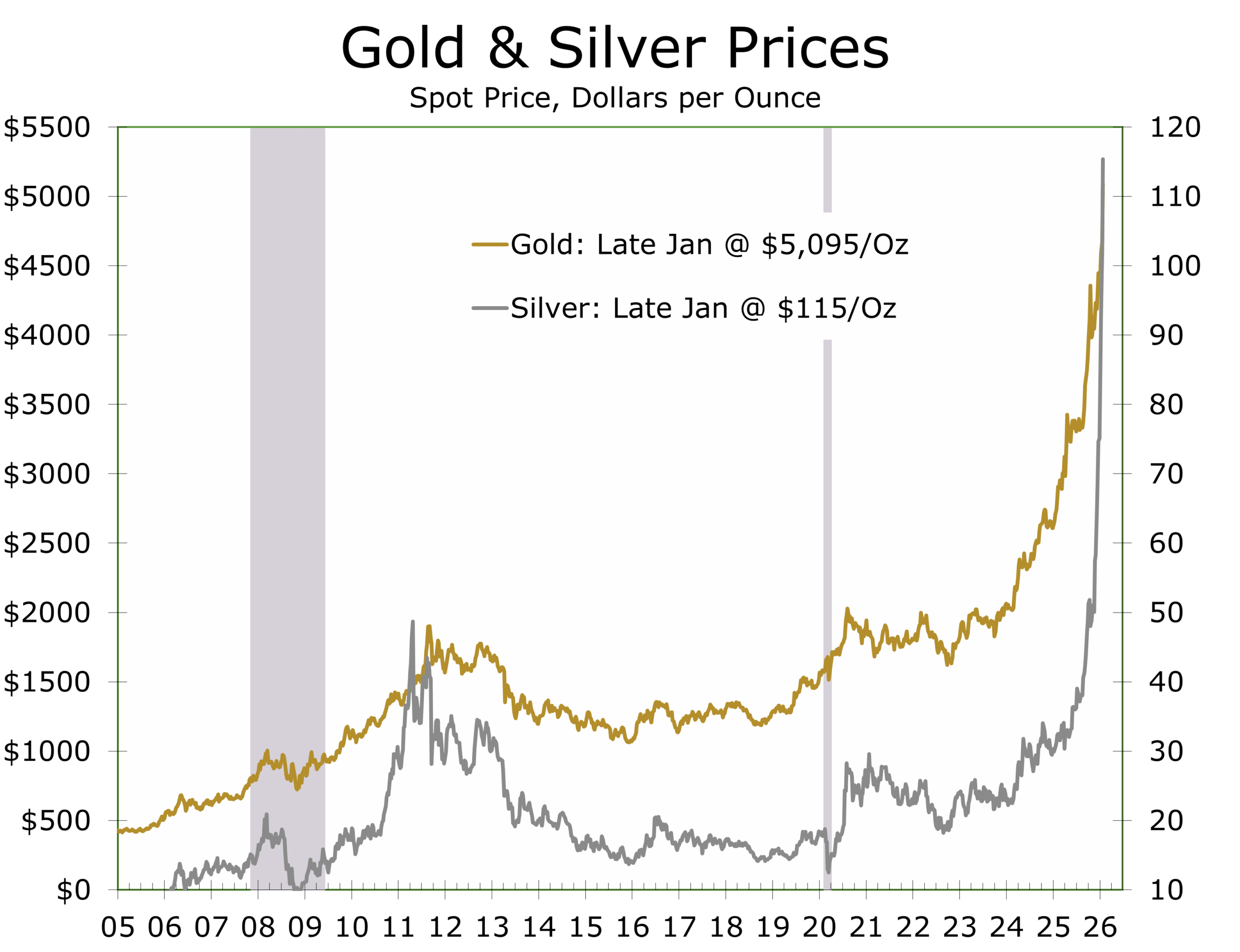 - Gold and silver crossed psychological thresholds as hedges against policy and institutional uncertainty, with positioning amplifying the move in silver.