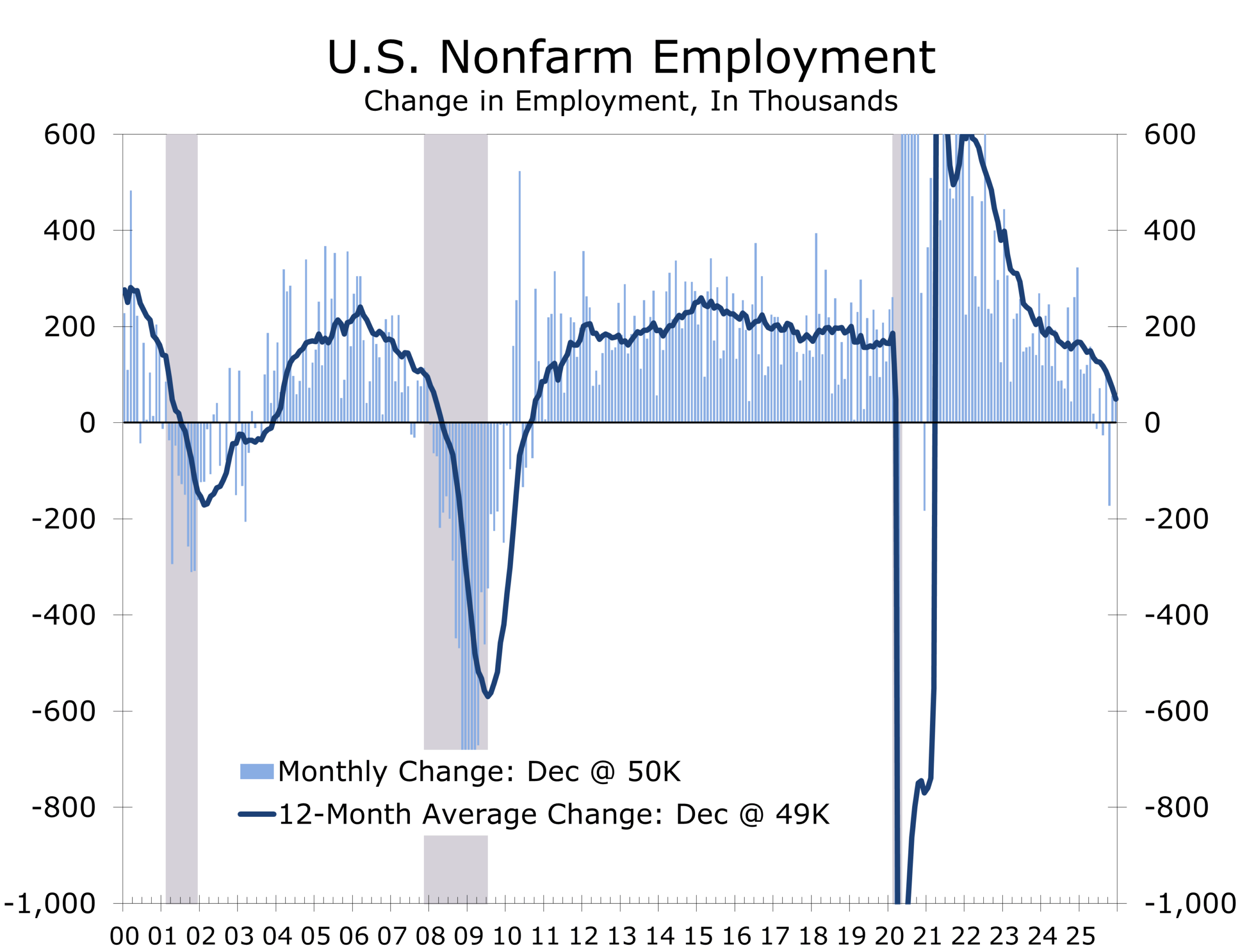 Revised GDP figures confirmed that the economy entered year-end with solid momentum. Prior-quarter growth was revised higher, and forward-looking indicators continue to point to above-trend activity. The Atlanta Fed’s GDPNow estimate for Q4 remains elevated, at +5.4%, suggesting growth has not meaningfully rolled over, which is perplexing given the weaker nonfarm payroll data.