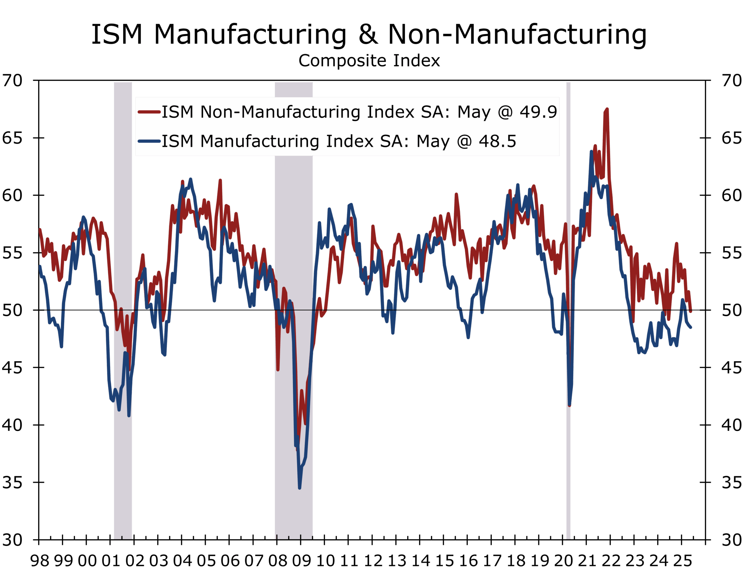 - ISM manufacturing and services indexes slipped into contraction territory.