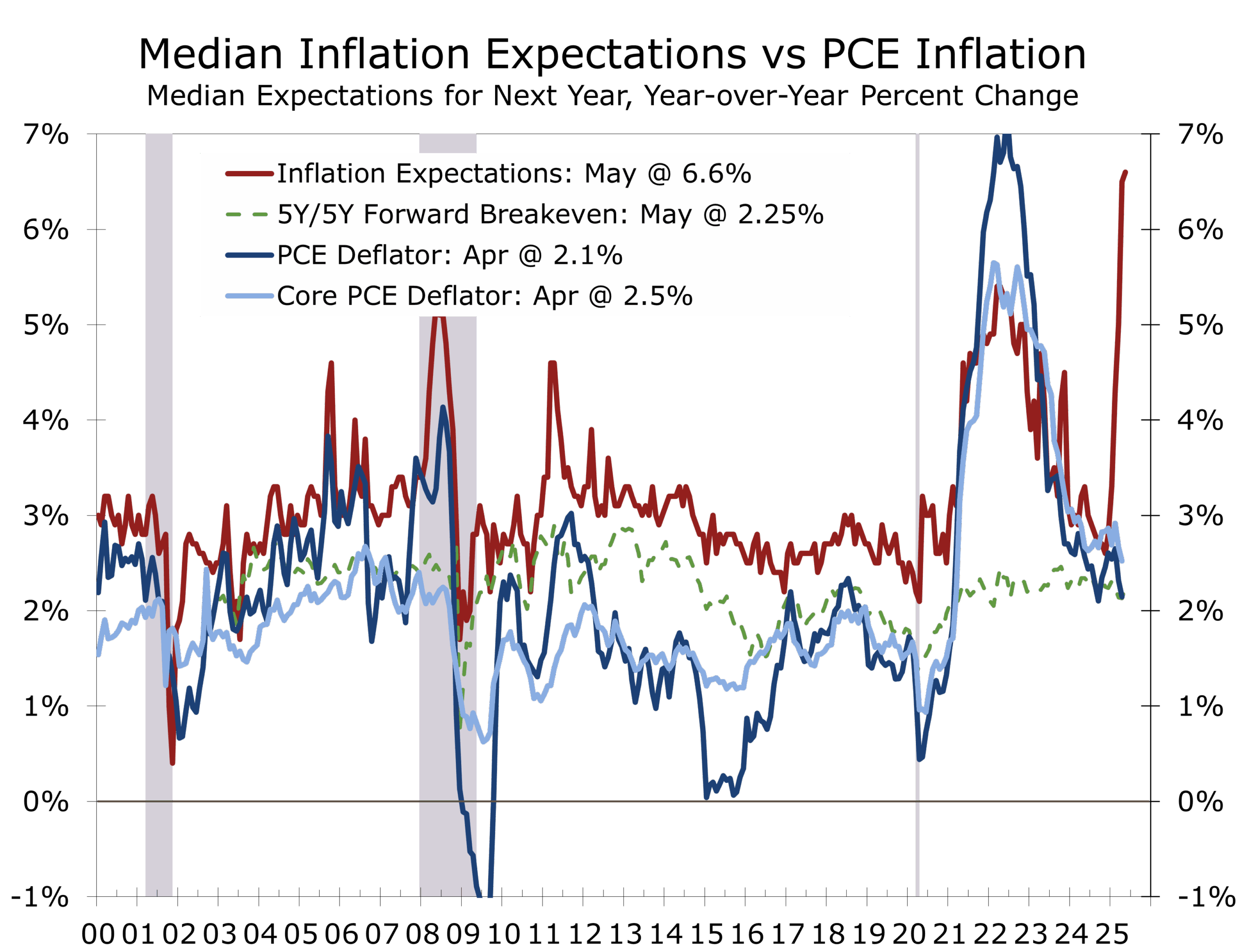 Tariff-related distortions continue to ripple through the economy, obscuring signals and intensifying uncertainty across supply chains. The April trade report revealed a collapse in goods imports—the sharpest monthly decline since the pandemic—with particularly steep drops in pharmaceuticals, gold, and motor vehicles. Imports from China alone have fallen 40% year to date, in response to tariff rates that exceeded 100% in April before being modestly scaled back. That dramatic import pullback sharply reduced the U.S. trade deficit, providing a temporary lift to Q2 GDP through a narrower trade deficit. The Atlanta Fed GDPNow forecast for Q2 is currently at 3.8%. The underlying details tell a less encouraging story: final sales to private domestic purchasers have softened, and investment in equipment and structures is losing momentum.