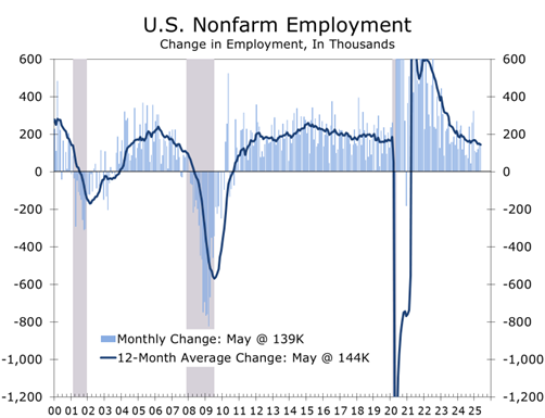 The May employment report showed the labor market is losing momentum and raised hopes that the Fed will cut rates a little sooner and by a little more than was expected earlier. Nonfarm payrolls rose by 139,000 in May—slightly below the 12-month average—and downward revisions shaved 95,000 jobs off the previous March and April estimates. Job growth remains concentrated in a narrow range of industries, with health care and hospitality accounting for the bulk of job gains.