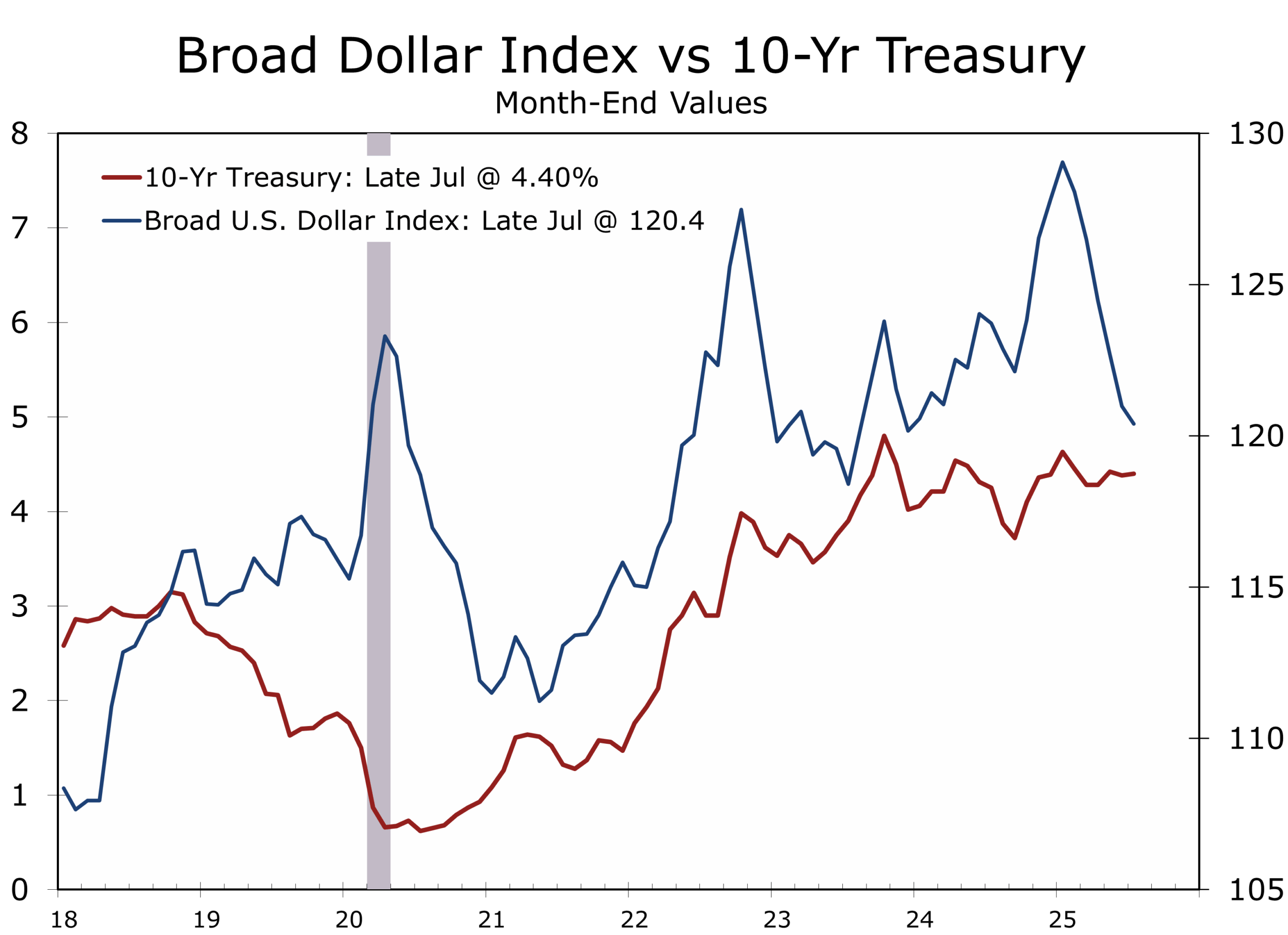 Tariff revenues are climbing, but so are investor concerns about policy unpredictability and inflation passthrough. The flurry of recent trade agreements has reduced—but not eliminated—uncertainty. The dollar’s recent weakening reflects this shift, as global investors begin to question how long the U.S. can remain the cleanest scorecard in the clubhouse.