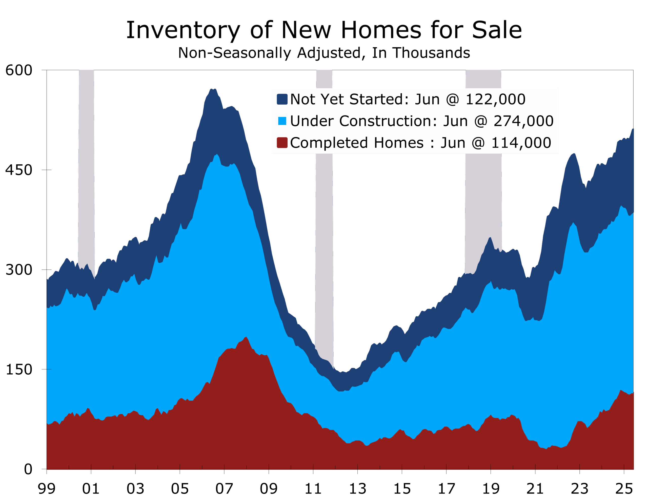 June’s existing home sales fell 2.7% to a 3.93 million annual pace, nearing post-GFC lows. The median existing home price climbed to a record $435,300, but that higher median price reflects a lack of inventory at the low end, not resurgent demand. Supply remains more than adequate at the upper end of the market. New home sales edged up just 0.6% to a 627,000 pace and are down 6.6% from a year ago. Builders are leaning on incentives and price cuts to sustain sales, but inventories of completed new homes continue to climb—now at their highest level since 2009. A substantial backlog of homes under construction also persists.
