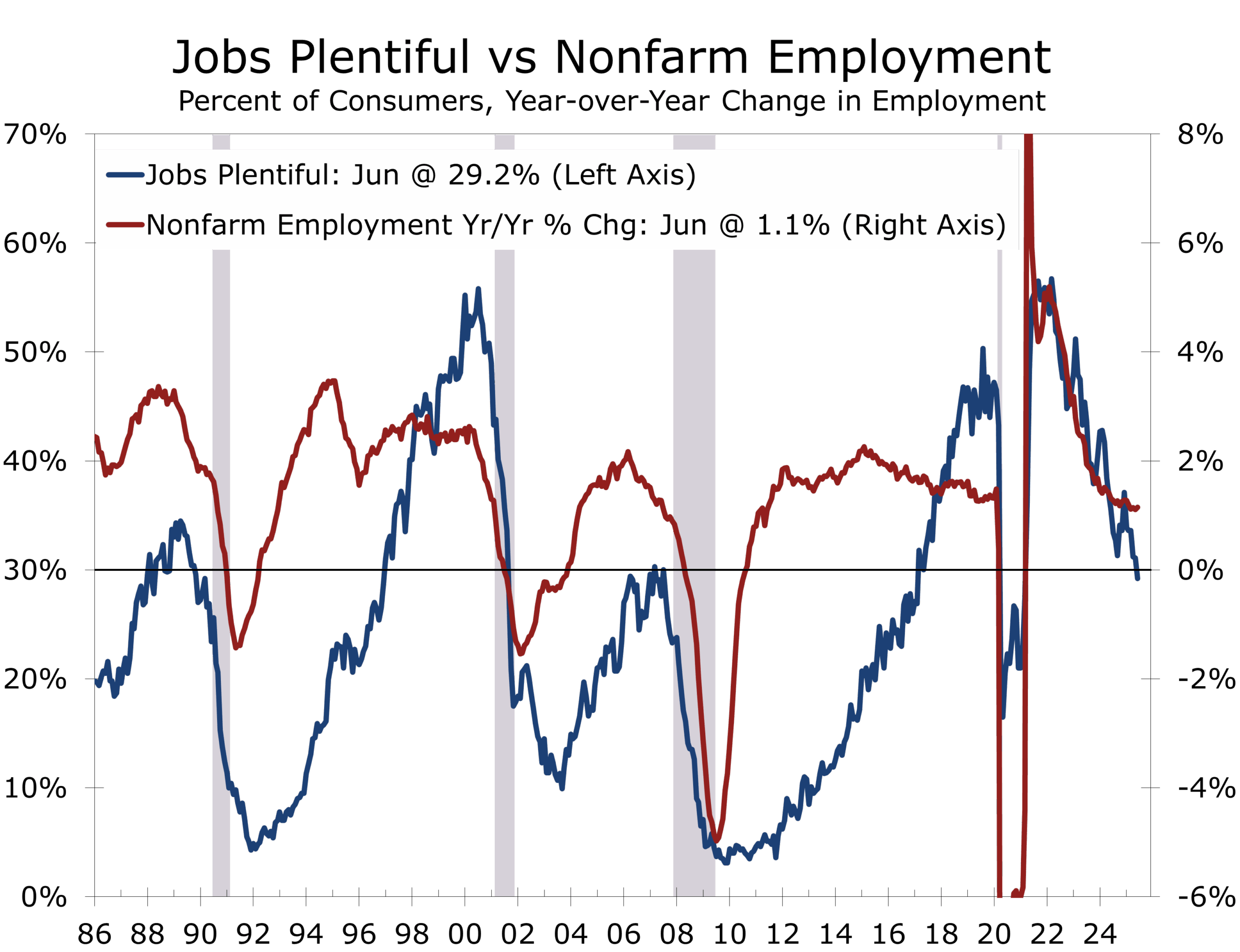 Openings likely declined again; many remain posted but unfilled. The quits rate is the one to watch. - Consumer Confidence (July)