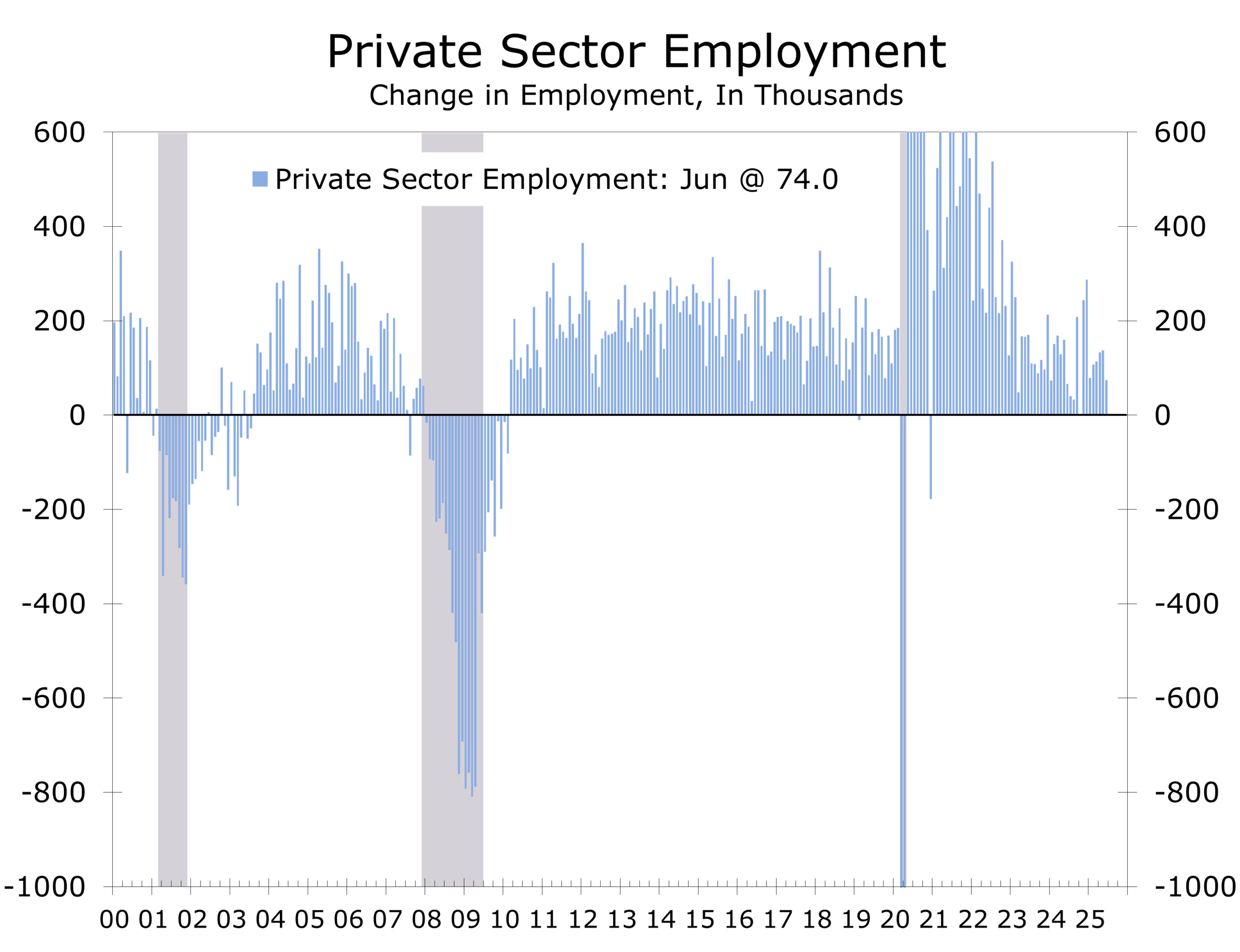 Initial jobless claims fell to 215,000—better than expected—but continued claims edged higher to 1.96 million. The divergence suggests a labor market in transition: layoffs remain low, but hiring is slowing. Quits are down, long-term unemployment is ticking up, and recent federal layoffs—enabled by a Supreme Court ruling that curbed agency protections—are beginning to register in the data. AI adoption may also be dampening hiring in the near term, even as it boosts productivity over time. In June, private employers added just 74,000 jobs, and a separate report from ADP showed private sector headcount declining by 33,000.