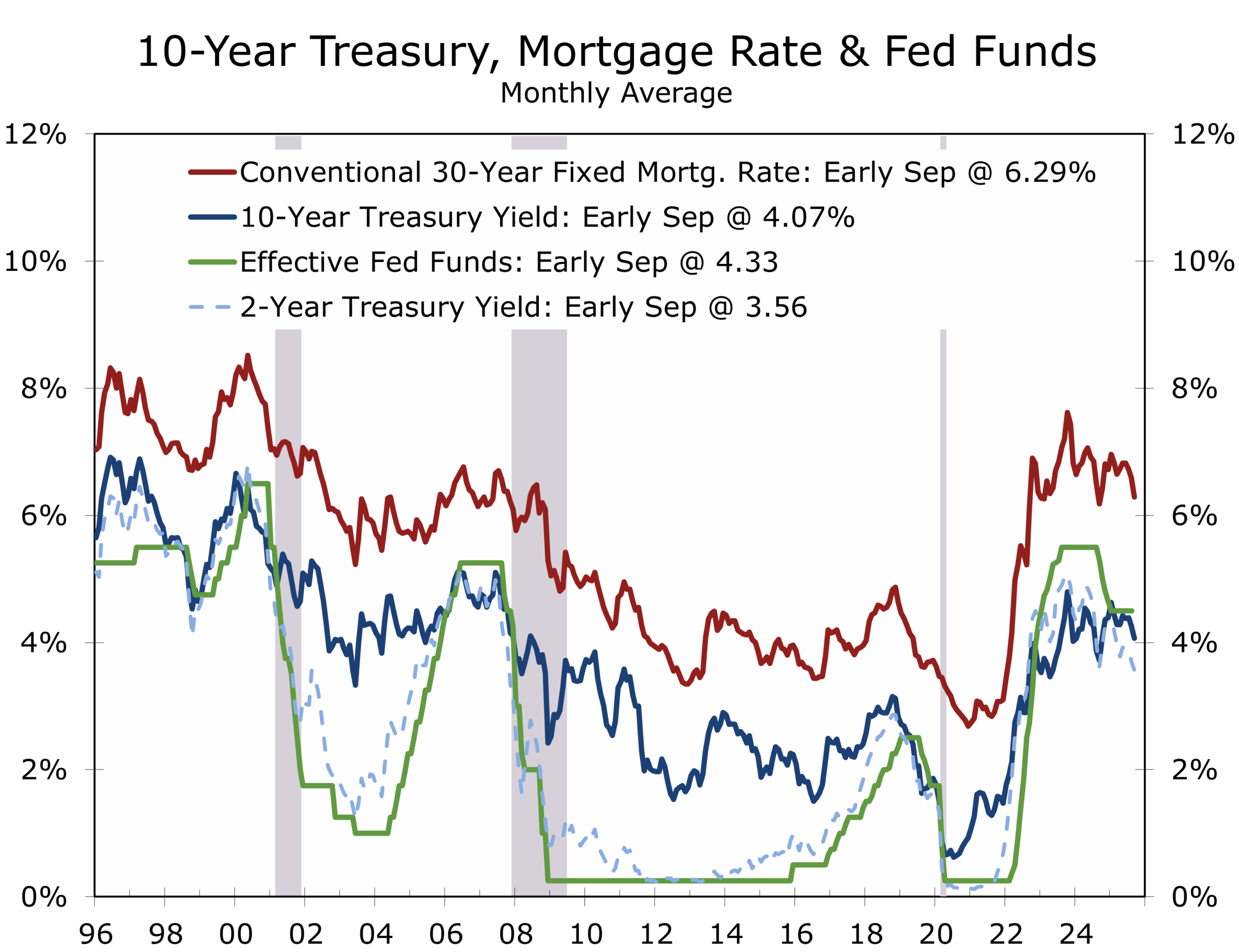 - Wednesday – September 17: Housing Starts expected to trend lower, with both single- and multifamily activity cooling. The FOMC is expected to cut the federal funds rate by 25bp; Powell’s tone and dot plot will shape expectations for further easing.