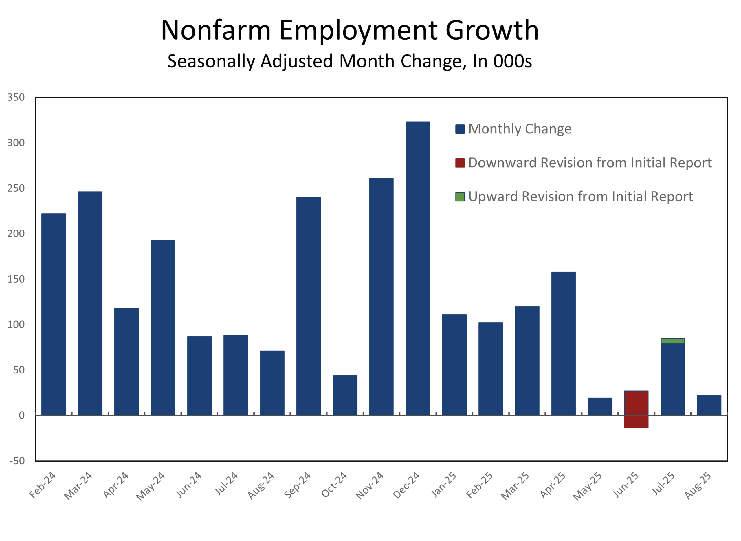 August’s payroll gain of just 22,000 was troubling on its own, but the real story came from the BLS’s preliminary benchmark revision incorporating QCEW data. The revision cut 911,000 jobs from payrolls between April 2024 and March 2025—the largest downward adjustment since at least 2000—halving average monthly gains to 71,000. Job growth has slowed even further since then, averaging only 41,000 per month from April through August.