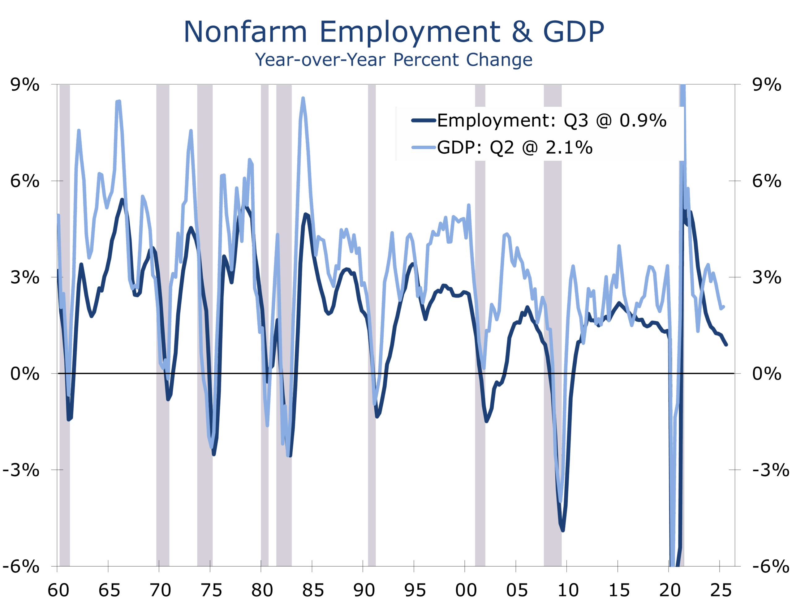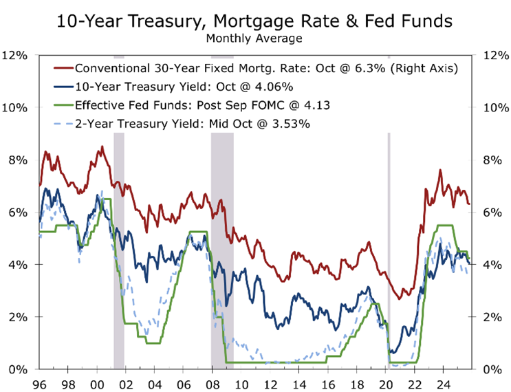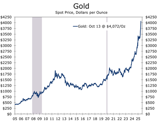 Meanwhile, the shutdown has turned the nation’s data stream into radio static. Economists have become codebreakers, piecing together fragments from Redbook, ADP, and credit-card data to fill the void. Expectations for Q3 GDP growth remain near 3%, but most Q4 forecasts have slipped into the 1.5%–1.8% range (a touch below our own 2.0%) as uncertainty delays spending and hiring decisions. Private indicators — and the federal furloughs that have thinned payrolls — suggest job growth is tepid at best and may already be turning negative. The larger question is how long the expansion can endure with the labor market faltering. History would say not long, but perhaps we are witnessing the rise of a second “new economy.”
