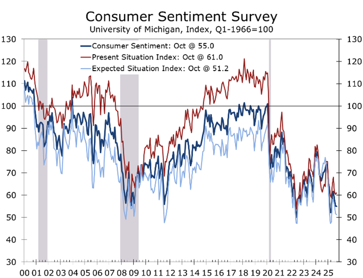 The early read on October consumer sentiment was steady on the surface but softening beneath. The University of Michigan index was virtually unchanged at 55.0 (down from 55.1), but consumers rated now as the worst time to buy durable goods since 2022. Year-ahead inflation expectations slipped modestly to 4.6%, while long-run expectations held at 3.7% — still above the Fed’s comfort zone.