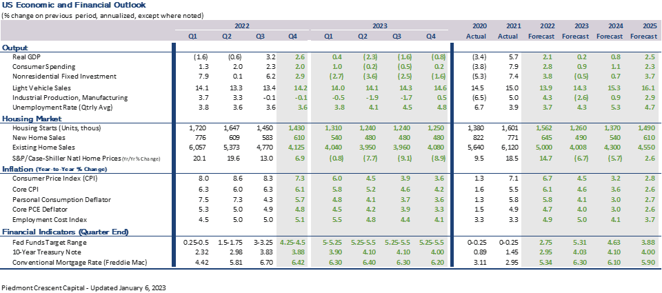 - Most forecasts for the coming year call for a ‘mild’ recession beginning the middle of 2023 and lasting for around six months.