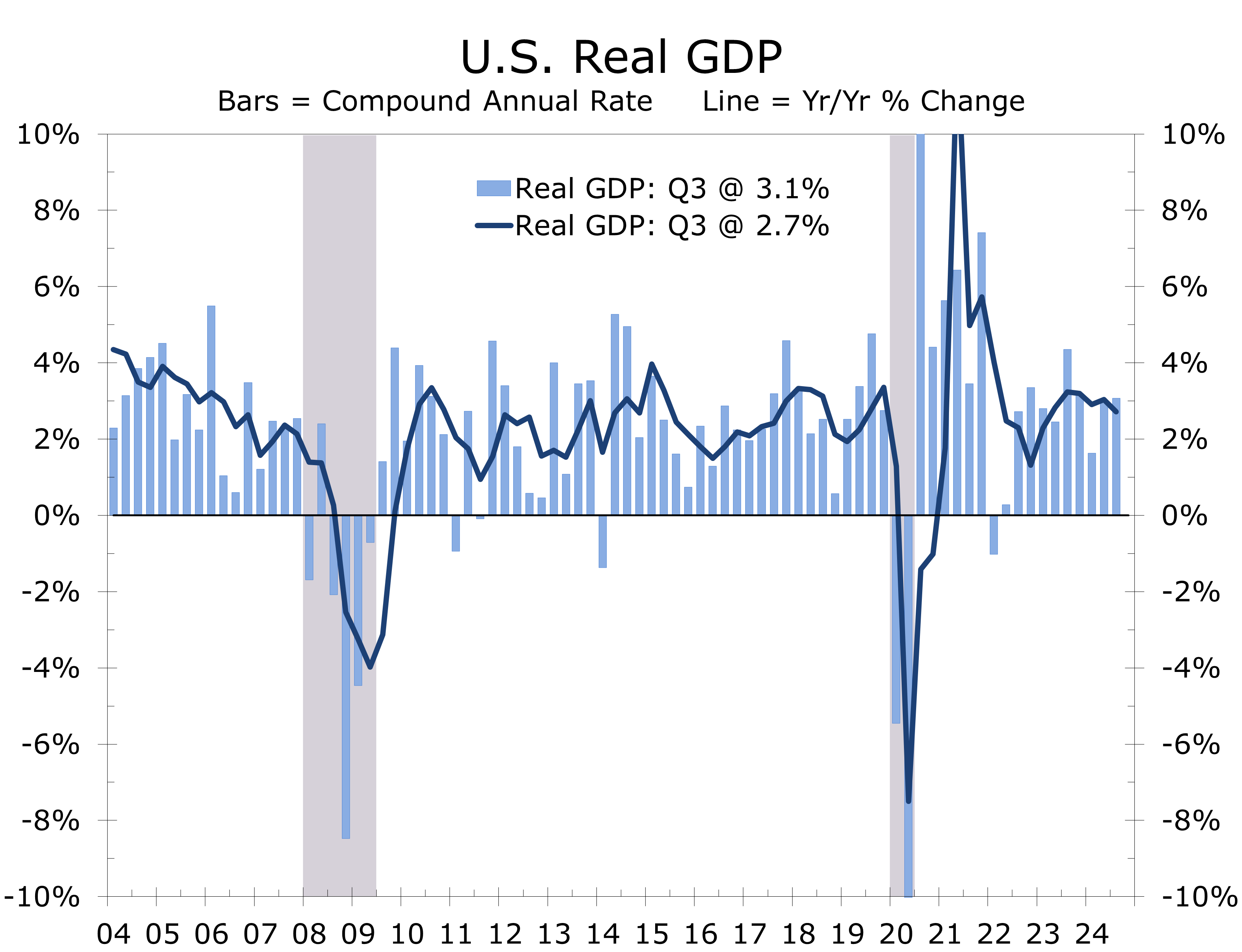 - Inflation concerns are tied to the surprisingly resilient U.S. economy, which began the New Year with strong momentum. While the ISM manufacturing survey shows the goods sector remains under pressure, the services side of the economy remains buoyant, and employers continue to add jobs in large numbers. Nonfarm payrolls ended 2024 on a strong note, with employers adding 256,000 net new jobs and the unemployment falling back to 4.1%. The latest Atlanta Fed GDPNow forecast pegs Q4 real GDP growth at a 2.7% pace.