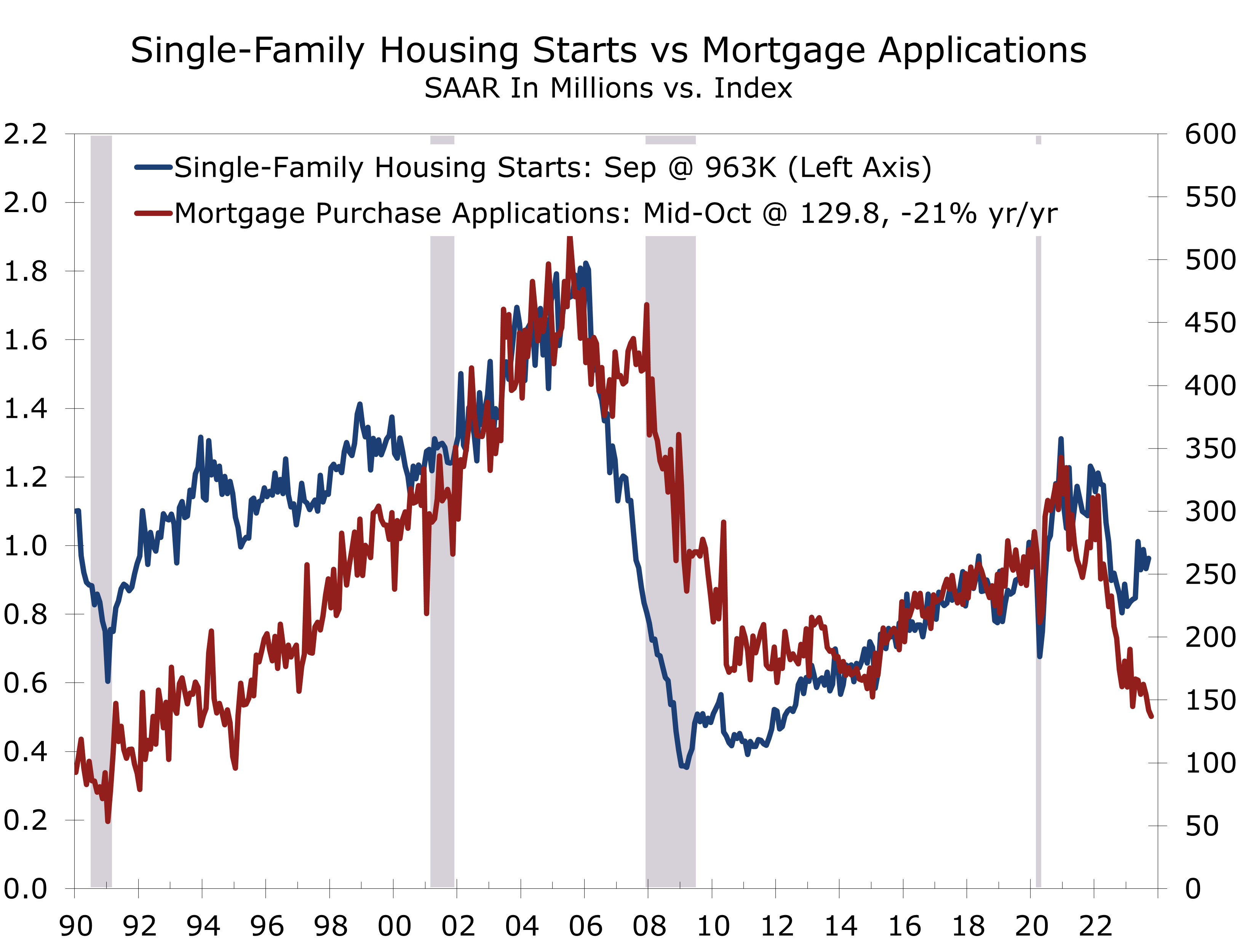 Single-family housing starts averaged a 961,000-unit pace over the past three months, while permits averaged a slightly lower 947,000-unit pace. We expect single-family starts to decline over the next few months and average a 930,000-unit pace in Q4 and 860,000 unit pace during the first half of 2024. Relative to past cycles, this would mark a soft landing for single-family home building, which remains chronically undersupplied. The primary challenge is affordability, which will not meaningfully improve until mortgage rates decline back in line with their long-run norms.