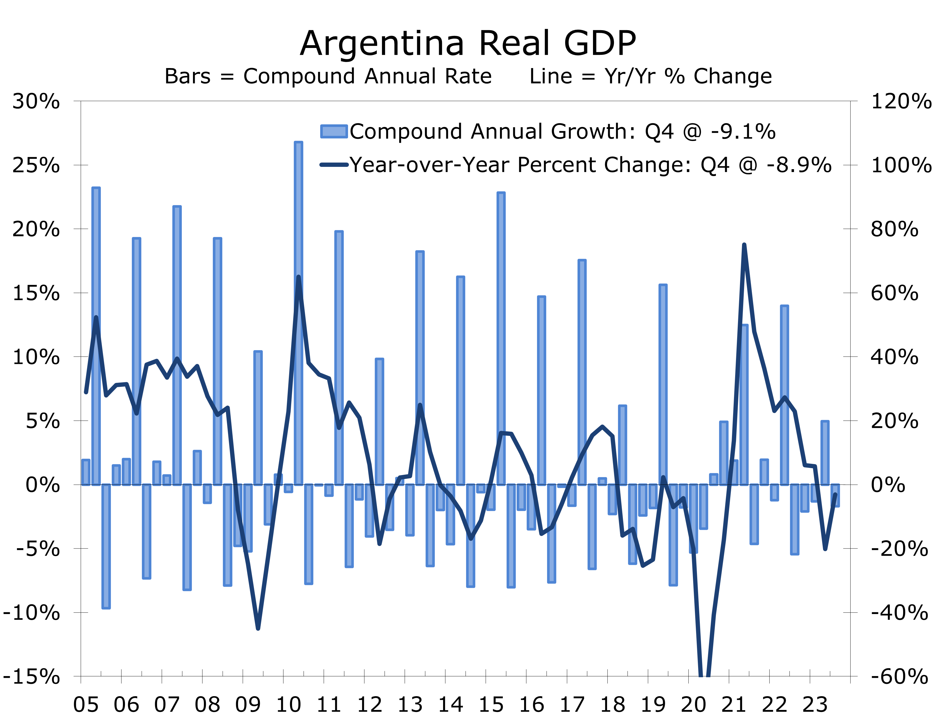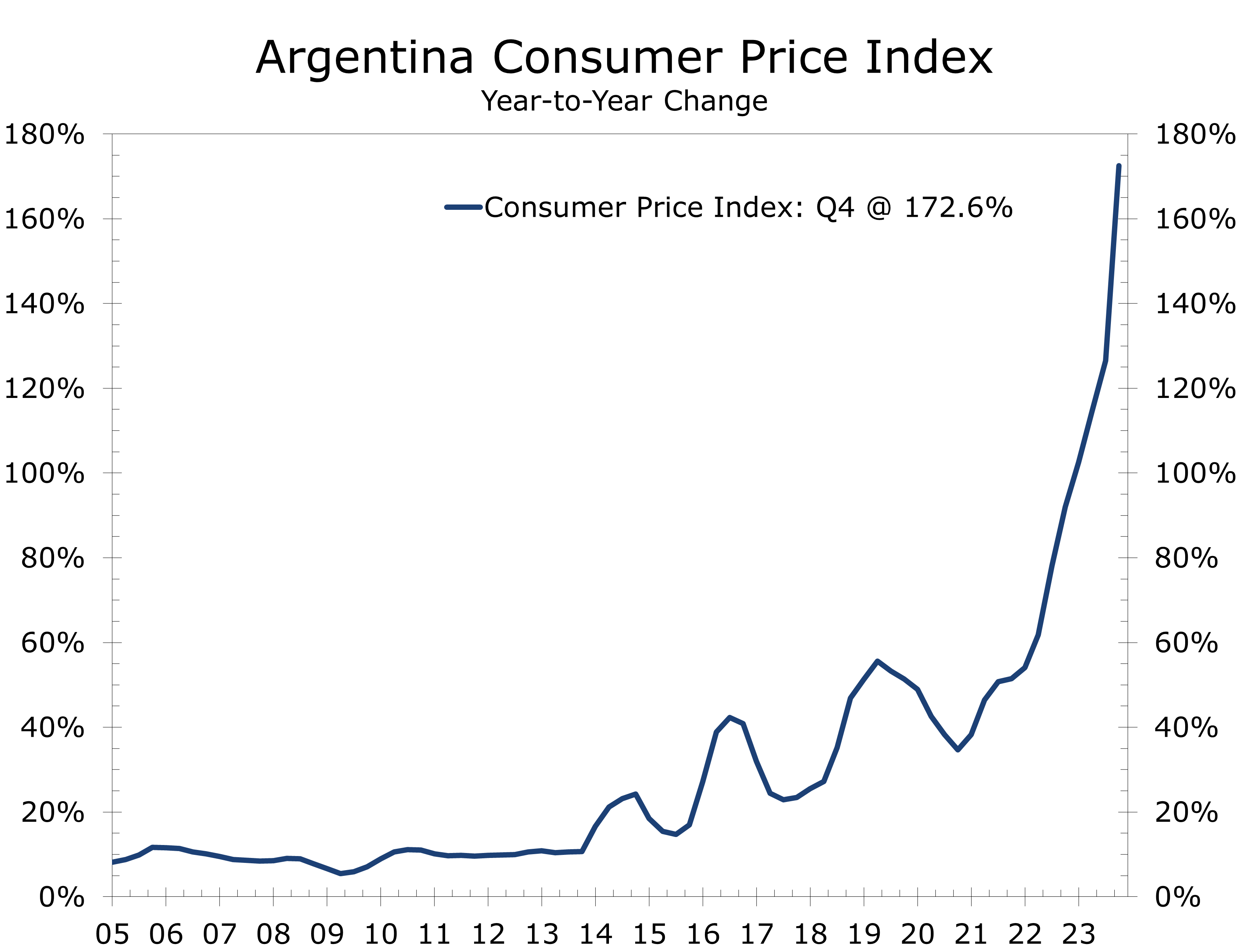 COVID-19 impacted Argentina particularly hard. Its GDP contracted by 10% at the pandemic’s onset. Inflation grew rapidly in 2021 and worsened the following years following the Russian invasion of Ukraine and a domestic drought.[1] Triple-digit inflation, not seen since the late 1980s, returned to Argentina. After decades of economic mismanagement from all factions of the Argentine political class, there was a hunger for drastic change going into the 2023 elections.