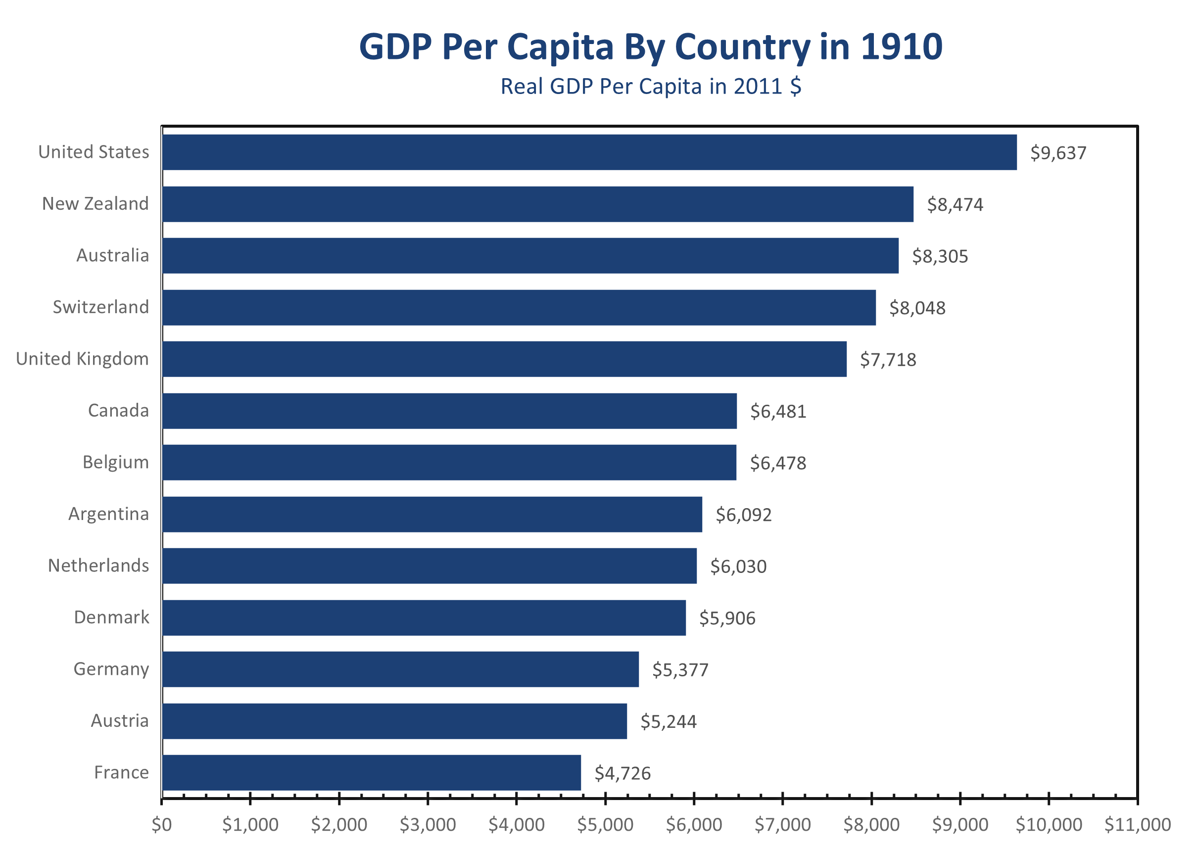 A century ago, Argentina’s GDP per capita rivaled Belgium, France, and Germany, and easily surpassed its former colonizer, Spain.[2] The capital, Buenos Aires, was widely viewed as the Paris of the West. The population is generally composed of people of European heritage and Argentina is widely viewed as the most European-like nation in Latin America.