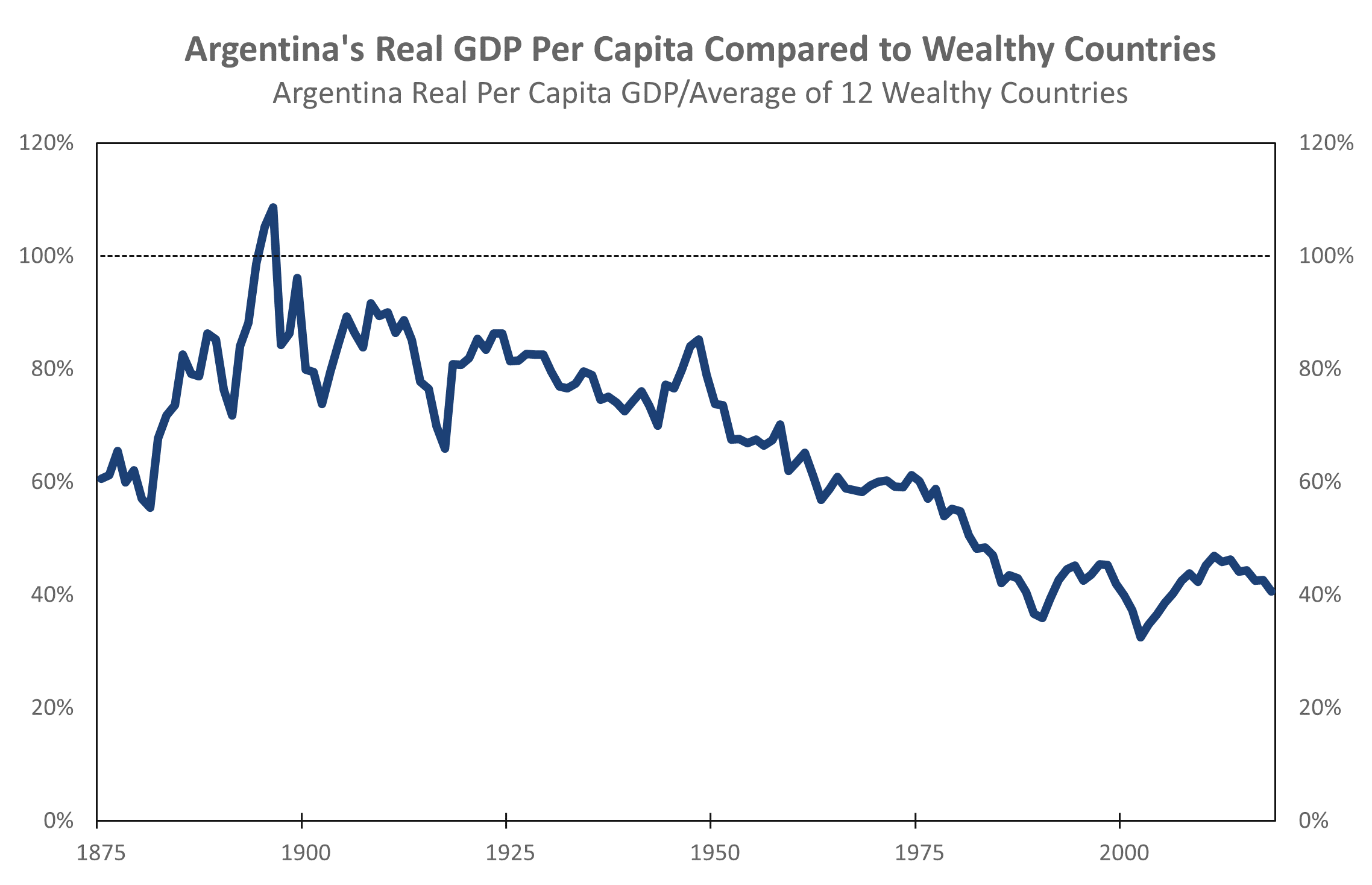 Researchers often refer to the rise and fall of Argentina as the “Argentine Paradox.” Once one of the wealthiest countries in the world, Argentina experienced a tenuous century of economic decline and political instability. The fall has served as a warning, mostly to Western governments that have run persistent fiscal deficits and have incessantly grown their administrative states. Argentina elected libertarian economist Javier Milei as president, who has vowed to reverse the decline by embracing free market economic principals.