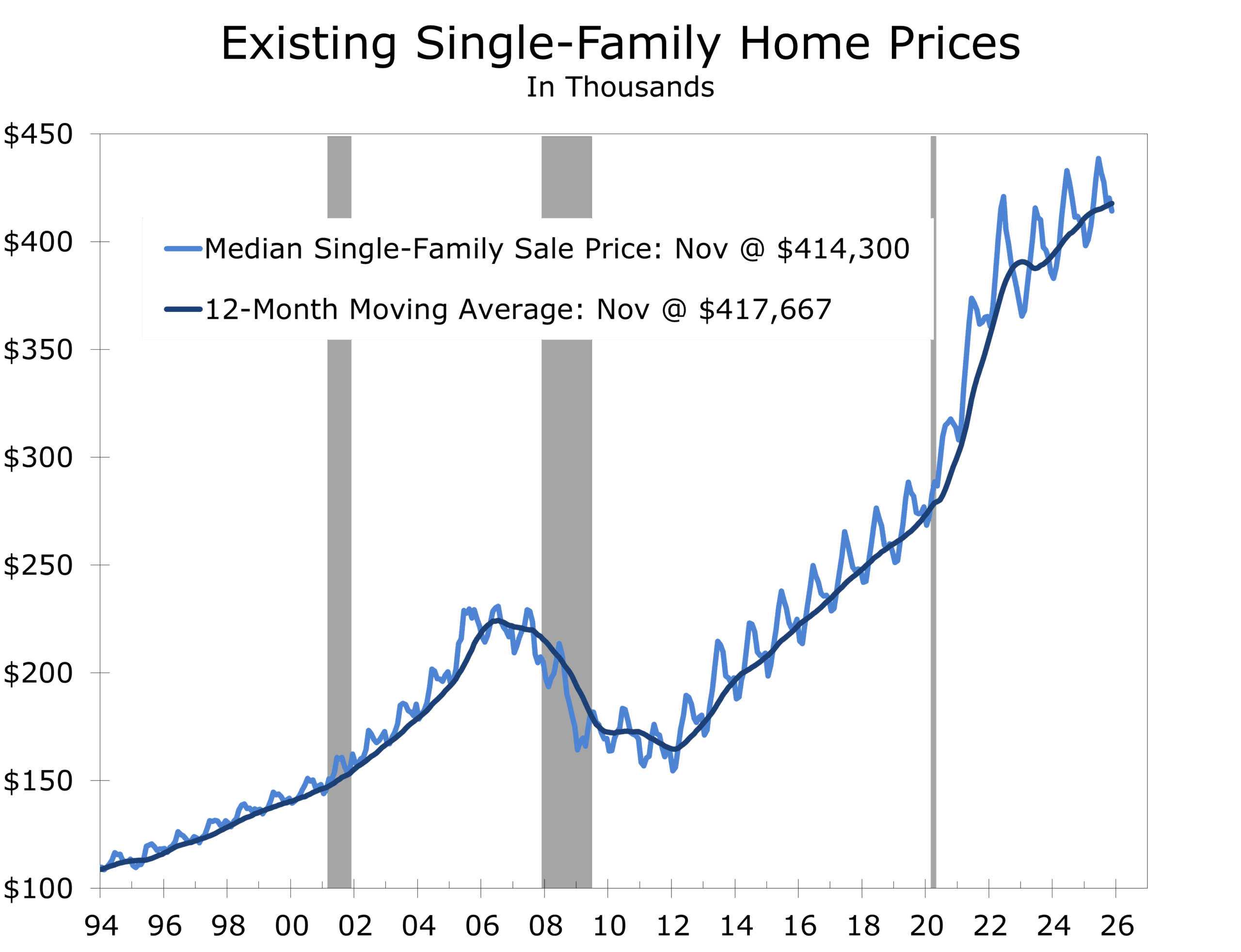 Homebuilder sentiment weakened at the start of the year as inventories of completed homes increased and near-term demand softened. Incentives remain widespread. Lower mortgage rates should provide incremental relief, but housing remains constrained by supply rather than collapsing demand. Existing home sales surprised to the upside, rising to a 4.35-million-unit pace, the strongest reading since early 2023.