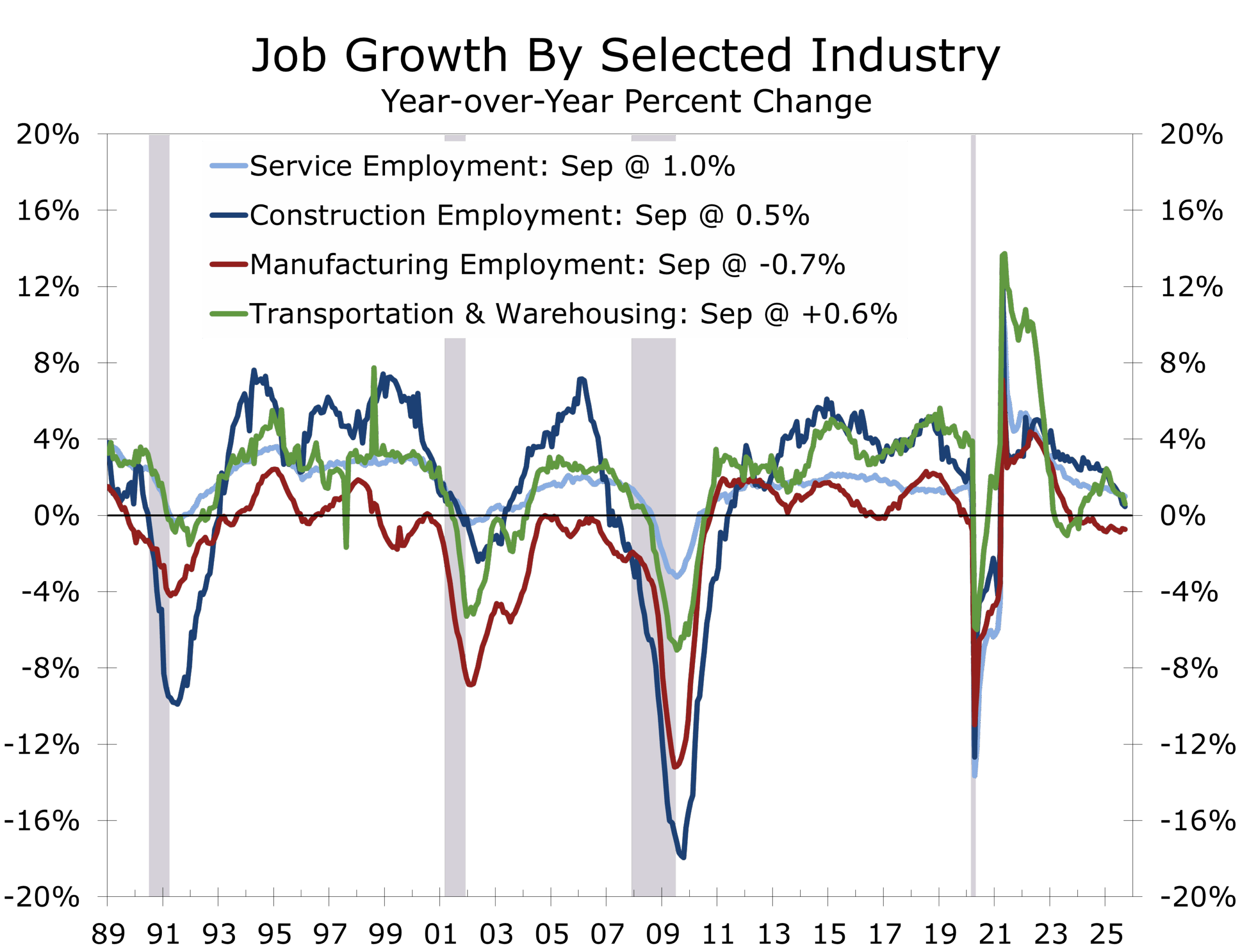 One relative bright spot: employment in the most cyclical parts of the economy — construction, manufacturing, and logistics — is holding up better than recessionary patterns would suggest. Construction remains modestly positive; manufacturing is only marginally negative; trucking shows mild year-to-year strength. In a downturn, all three would be sharply negative. This is one of the strongest arguments against the notion that the U.S. is sliding into recession today. Of course, these are preliminary figures and the revised data in February are expected to result in large downward revisions.