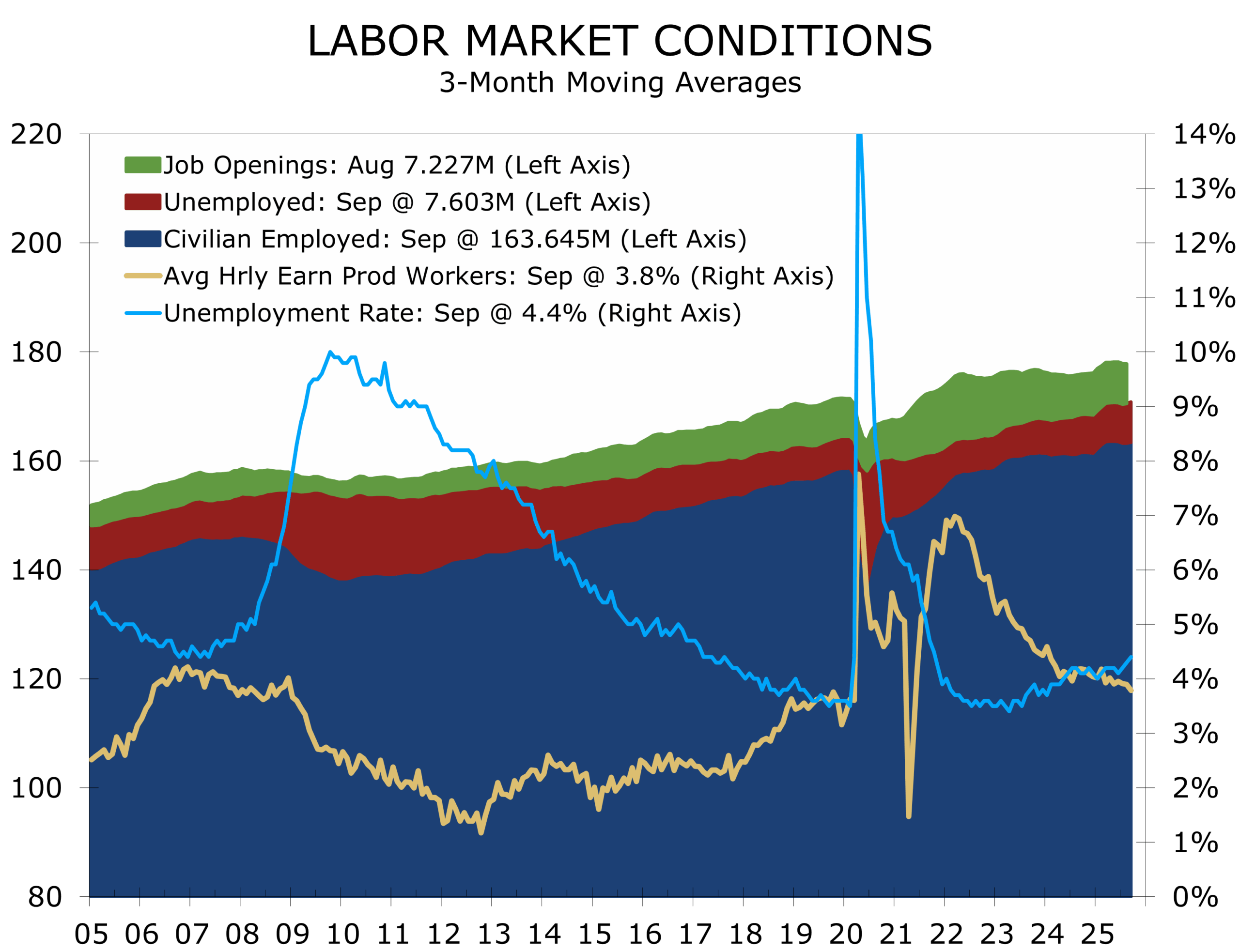 Labor markets are bending, not breaking. The still low unemployment rate likely overstates strength, while the surge in layoff announcements likely overstates weakness. The truth lies somewhere in between—a cooler, more cautious labor market with meaningful pockets of resilience, with payroll gains averaging 75,000 a month.