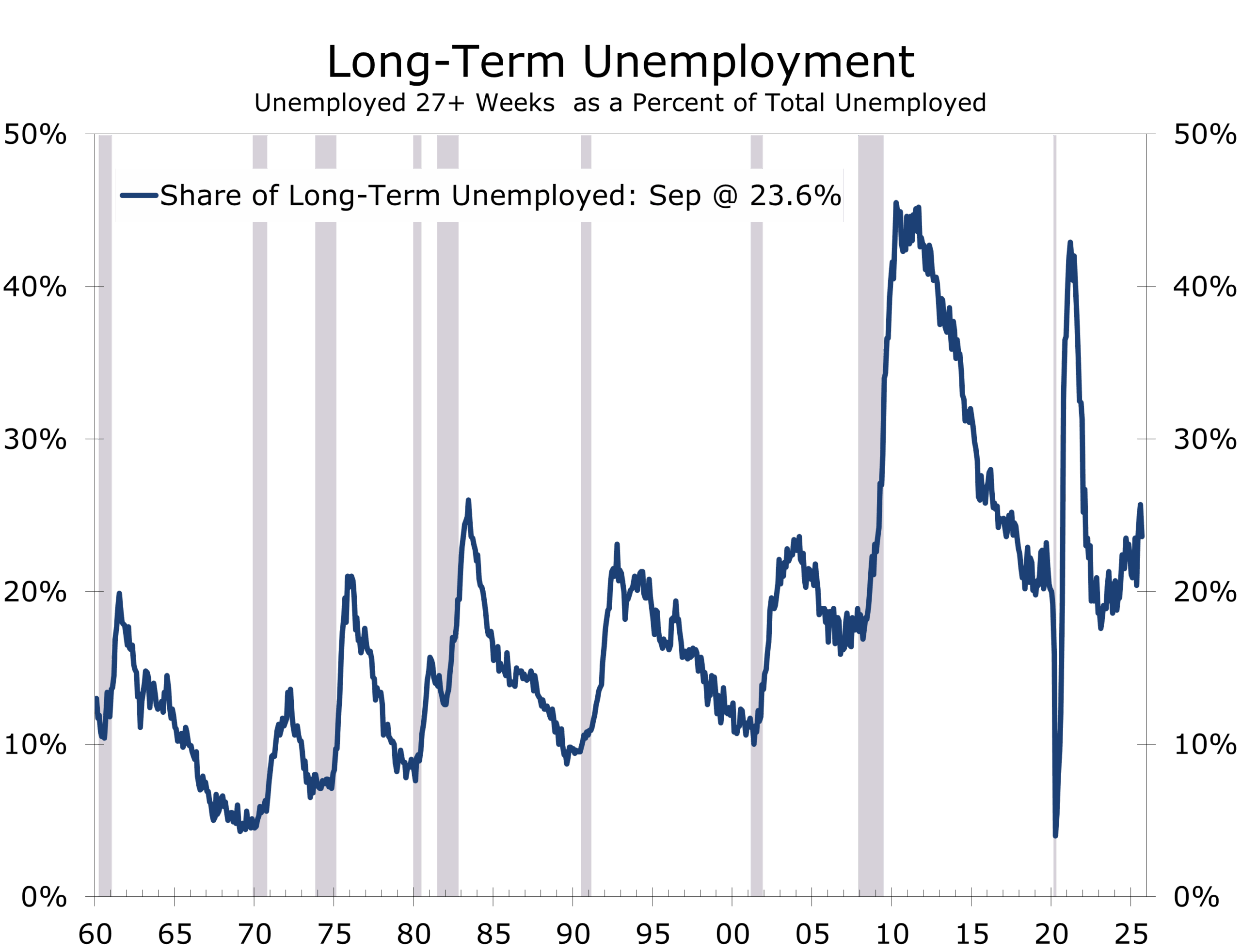 Revisions to July and August subtracted 33,000 jobs from the previous data, reminding us that the prior trend was weaker than first reported. And while the headline unemployment rate held at 4.4%, its highest since October 2021, the increase was driven partly by a surprisingly strong 470,000 jump in labor-force entrants. The influx is a sign that workers are reentering the job market rather than disengaging from it — a positive development. The household survey also showed rising permanent job losses, however, which climbed above 2 million for the first time since late 2021 — an unsettling development when hiring outside of a few industries remains sluggish. The trend has means a growing share of the unemployed have been without a job for 27 weeks or more.