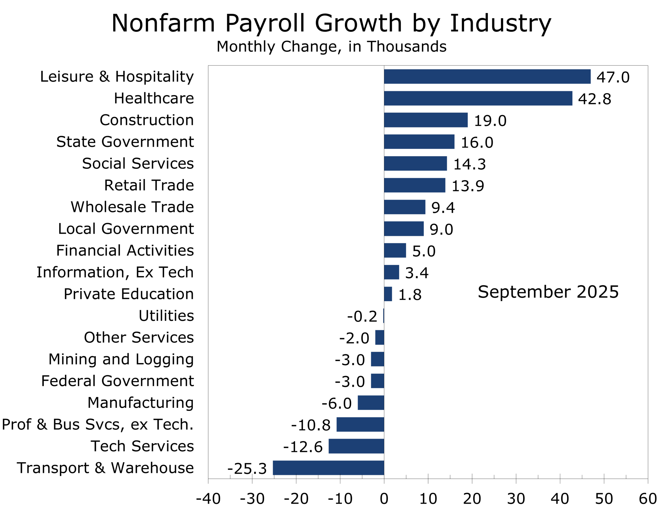 Meanwhile, the soft spots remained firmly in place. Transportation and warehousing shed 25,000 jobs, driven by losses in warehousing (–11,000) and couriers (–7,000). Professional and business services — often a bellwether for white-collar demand — also weakened. Temporary staffing was a notable weak spot but employment also fell in tech-centric industries. And federal employment declined another 3,000 ahead of what is expected to be a huge drop in October and November, as DOGE-related retirements and separations will show up.