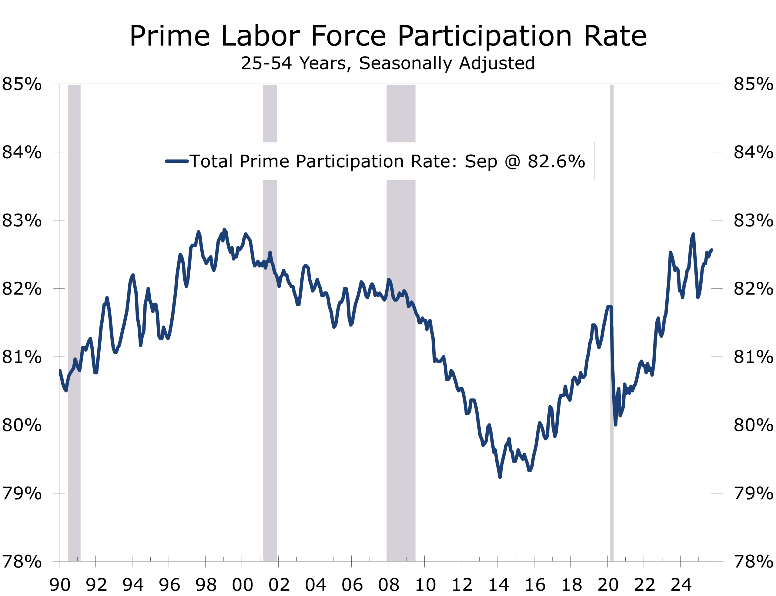 The share of the prime working-age population at work remains high, at just over 80%, and the Sahm Rule remains far from its triggering level, reinforcing that conditions do not yet meet recession thresholds.