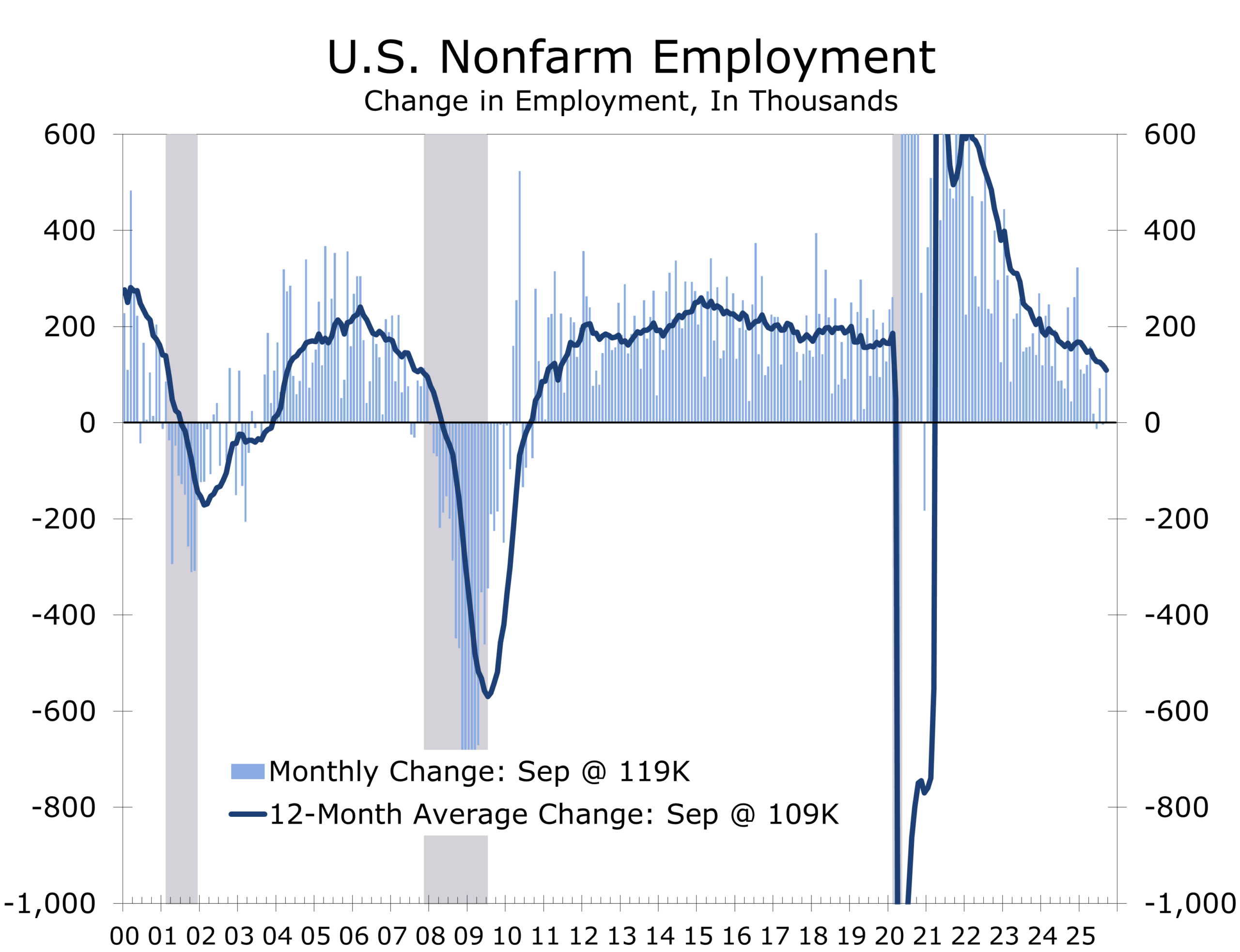 - The September employment report supports the case for further Fed easing, though the shutdown-delayed data release schedule complicates the timing. We continue to call for a quarter point cut, as we do not expect to see compelling evidence to suggest otherwise before the Fed meets on December 9-10.