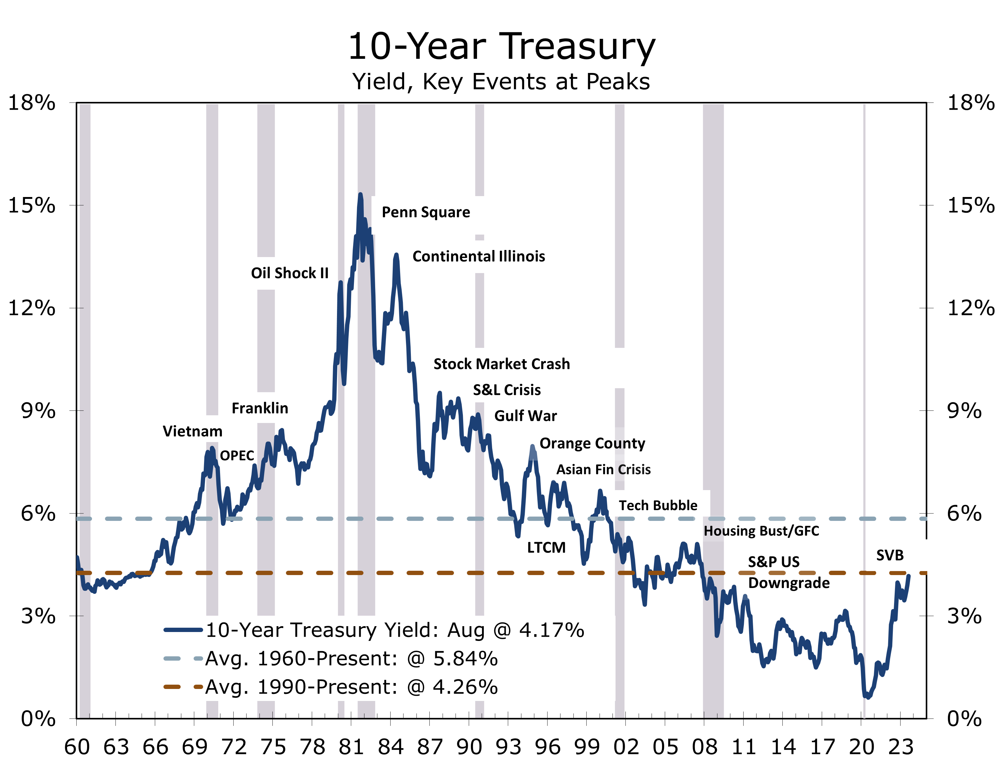 Longer term we see the federal funds rate averaging around 3% through the rest of the decade, which is a half percentage point above the Fed’s current estimate for the longer funds rate. A federal funds rate at this level would be consistent with the 10-Year Treasury averaging between 4% and 4.25% through the end of the decade, which is well above current consensus estimates but well within historic norms.