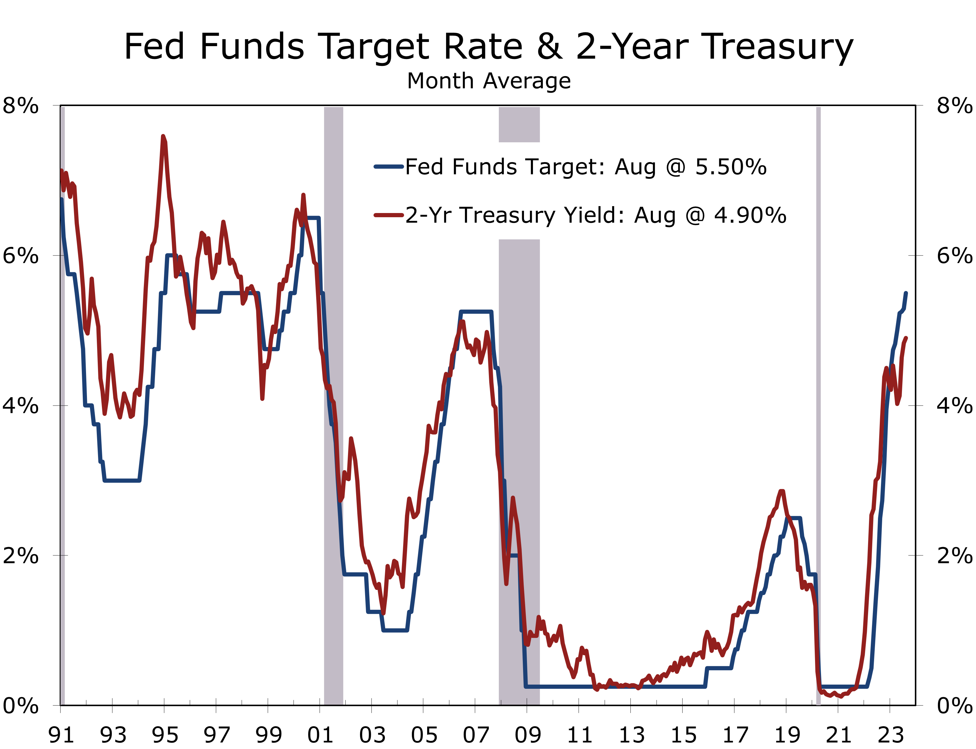 More fundamentally, we expect the economy to slow in response to higher interest rates, tightening credit conditions and waning fiscal stimulus. Higher interest rates are already weighing on new and used vehicle sales. This summer’s surprising strength in new home sales also looks like it is fading, given the recent slide in mortgage applications. Tighter credit will also lead to more bankruptcies and layoffs, as more companies face difficulty rolling over maturing debt. Additionally, the resumption of student loan repayments may dampen consumer spending, particularly in discretionary services, although it might slightly boost labor force growth.