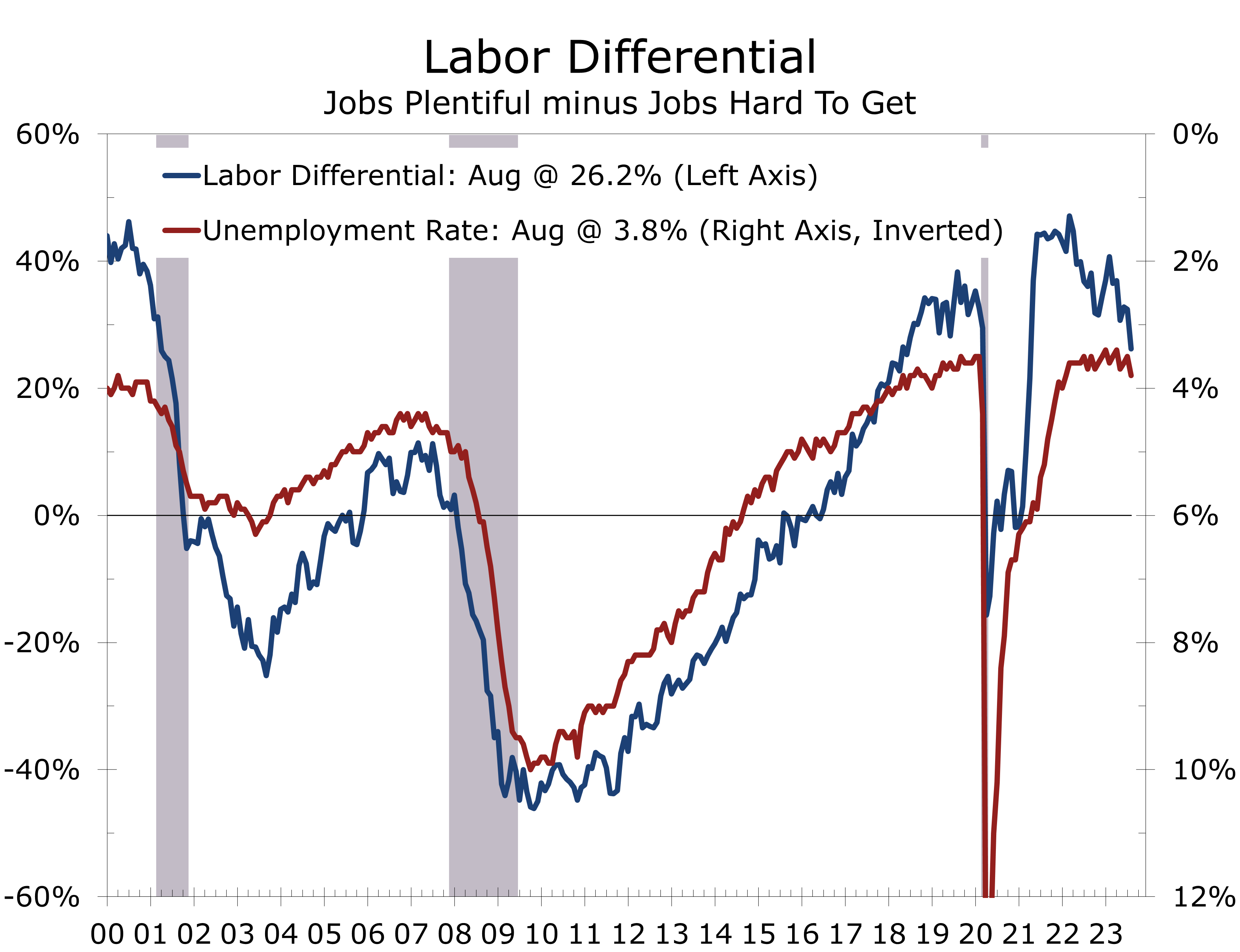 With a little more slack in the labor market, wage increases can continue to moderate. Average hourly earnings rose just 0.2% in August and are now up 4.3% year-to-year on an overall basis and up 4.5% year-to-year for production workers. The deceleration in wage increases is backed up by survey data from the Atlanta Fed and private sources. Wage pressures are still too high, however, to bring inflation back down to the Fed’s 2% target, particularly with labor disputes becoming more frequent and the major motor vehicle producers facing contentious contract negotiations with the United Auto Workers this month. Given recent productivity trends, wage increases would need to be 3.5% or less to bring inflation back to 2% on a sustained basis.