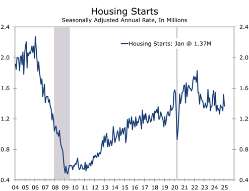 Home builders are beginning the year cautiously, as many would-be buyers remain on the sidelines due to persistent affordability concerns. Housing starts declined 9.8% to a 1.37 million unit pace in January, with single-family starts falling 8.4% to 993,000 units, 1.8% below their year ago pace. Multifamily starts plunged 13.5% to a 373,000 unit pace, reflecting rising vacancies, softening rents and tight credit conditions. Builder confidence also declined, and builders have scaled back sales expectations for this year.