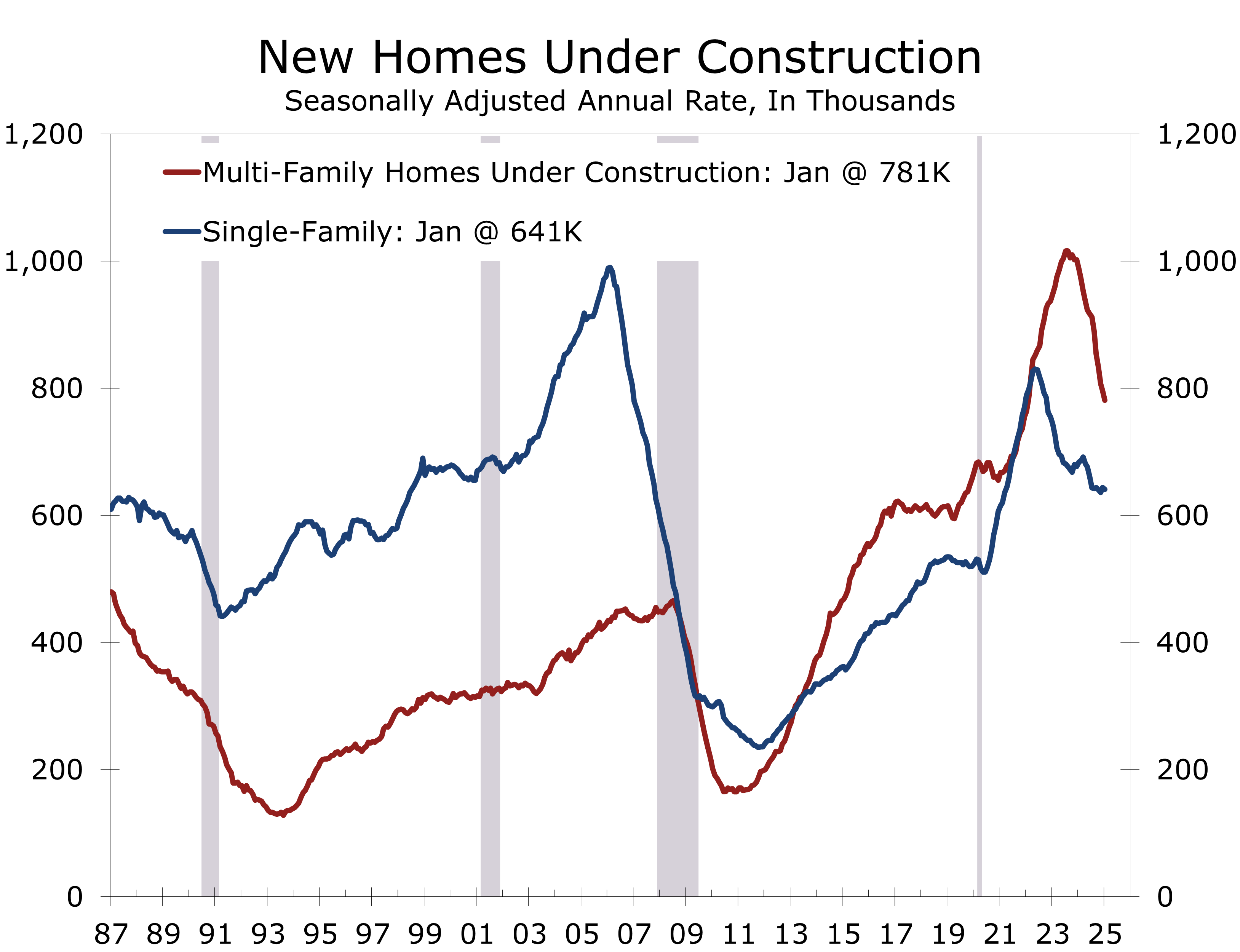 The number of homes under construction continues to decline, with single-family units down 6.3% over the past year and permits for projects with five or more units plunging 22.5%. This slowdown in new construction will likely impact employment and Q1 GDP growth. Housing has significant ripple effects, driving demand for furniture, appliances, and services, making this decline a potential warning sign for broader economic weakness.