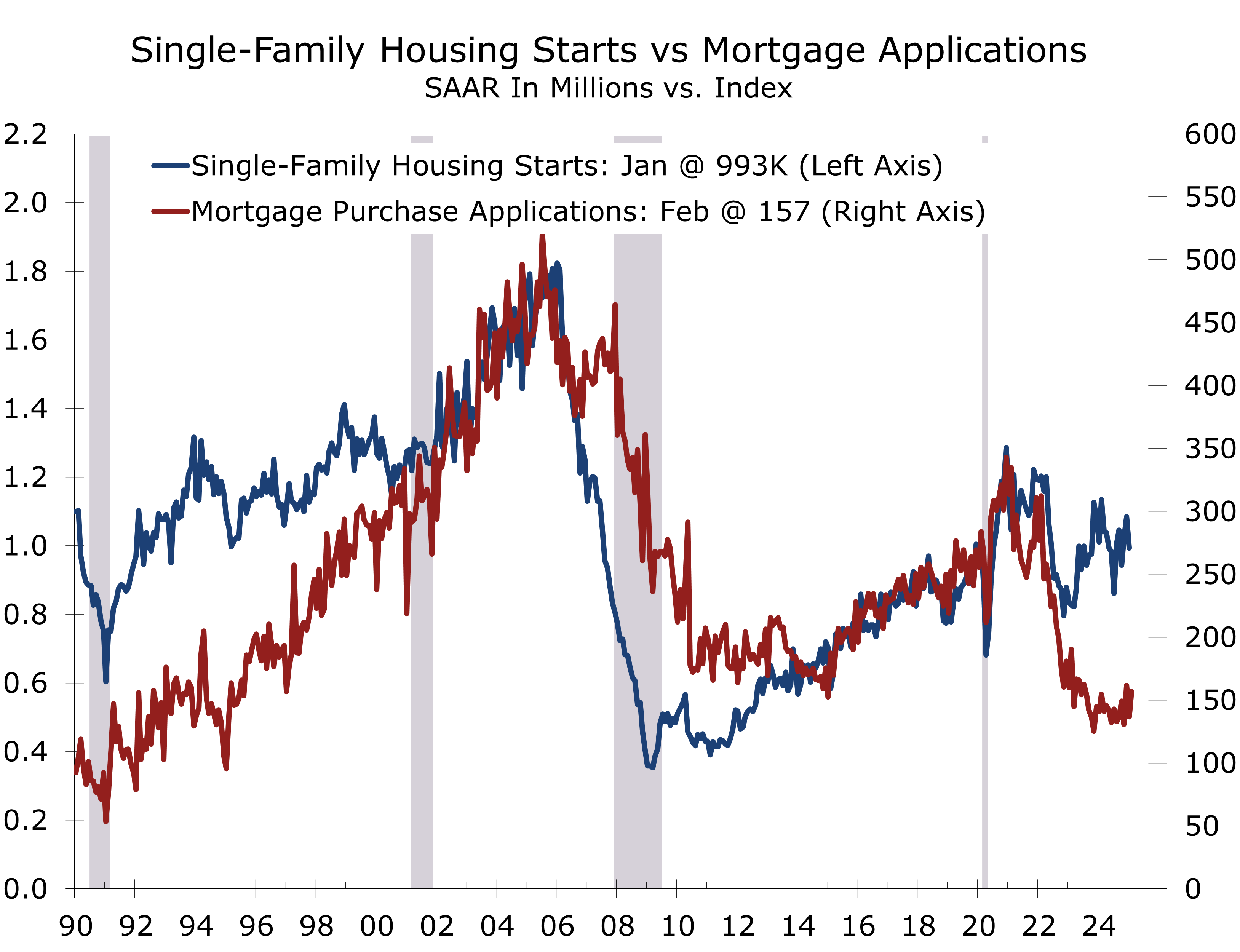 The ongoing decline in sentiment points to a slowdown in new construction, which could weigh on economic growth. While weaker growth may push bond yields lower and reduce mortgage rates, it would also likely dampen job and income growth, further restraining homebuying. Single-family starts for the rental market are also set to slow, facing the same pressures—rising vacancy rates and weakening rents—that are curbing traditional apartment construction.
