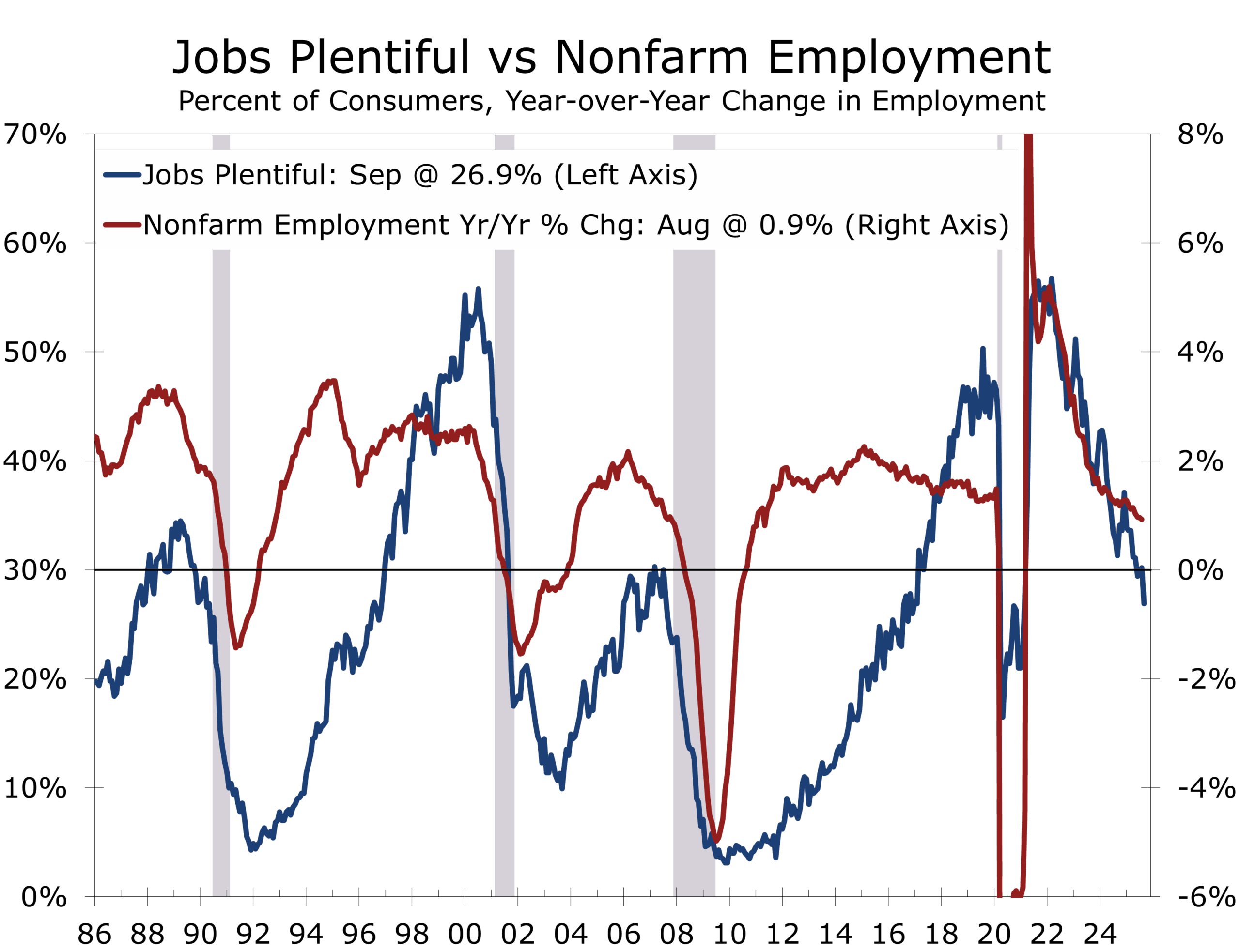 Consumer confidence fell slightly more than expected and the underlying details suggest the expansion remains more fragile than recently upgraded GDP forecasts suggest. The steep decline in the Present Situation Index reflected growing unease about business conditions and job availability. The share of consumers saying jobs are “plentiful” fell to 26.9%, down from 30.2% in August, while 19.1% said jobs are “hard to get.” This pushed the labor market differential down to 7.8, its lowest reading since February 2021.