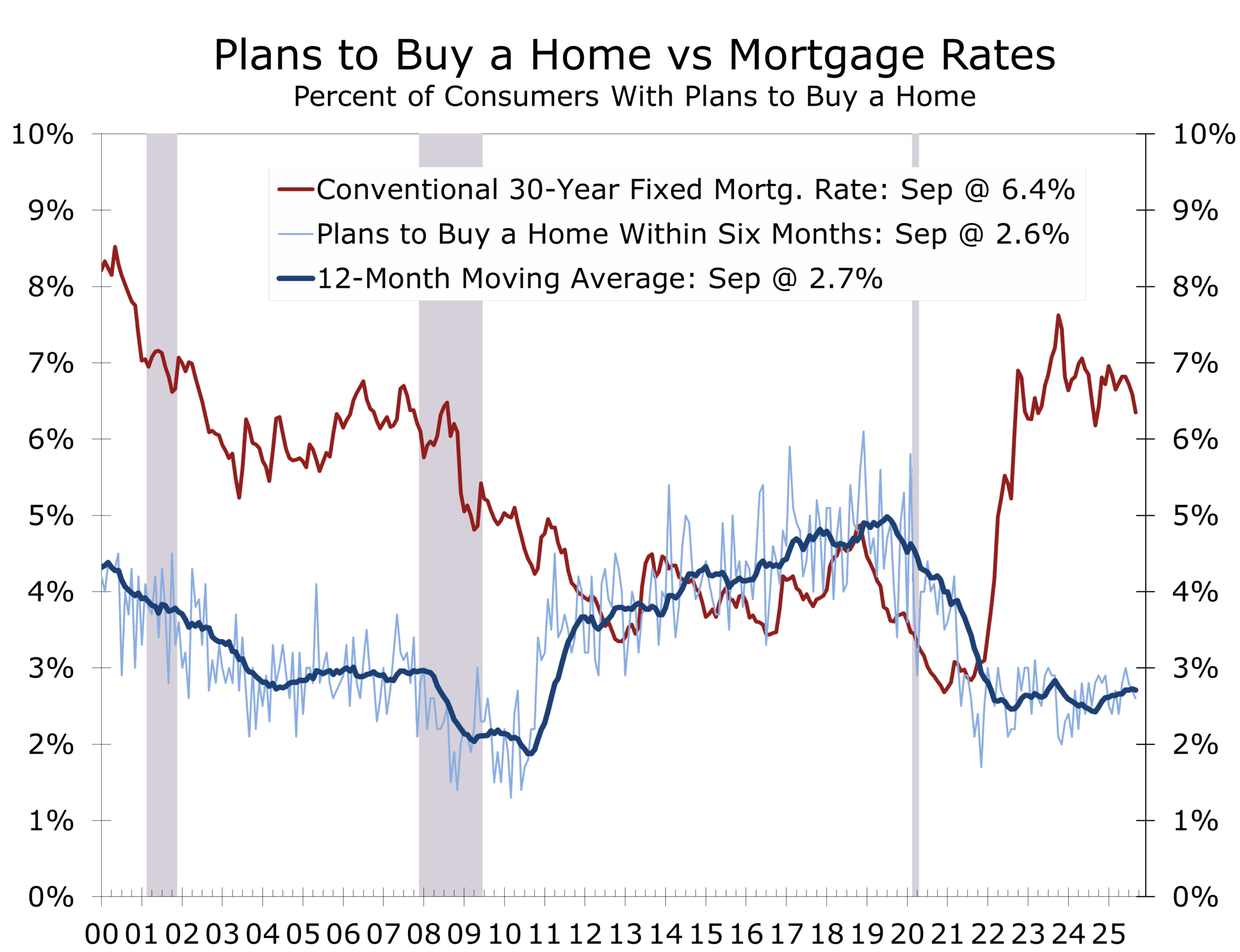 Spending intentions remain uneven. Home buying plans climbed to a four-month high as lower mortgage rates lured some buyers back, but auto purchases slipped under the weight of high financing costs. Travel plans weakened further, with international trips leading the decline. The link between sentiment and spending has loosened. Spending is outperforming income growth, however, indicating that wealth is helping sustain spending as job growth slows and worries about employment security increase.