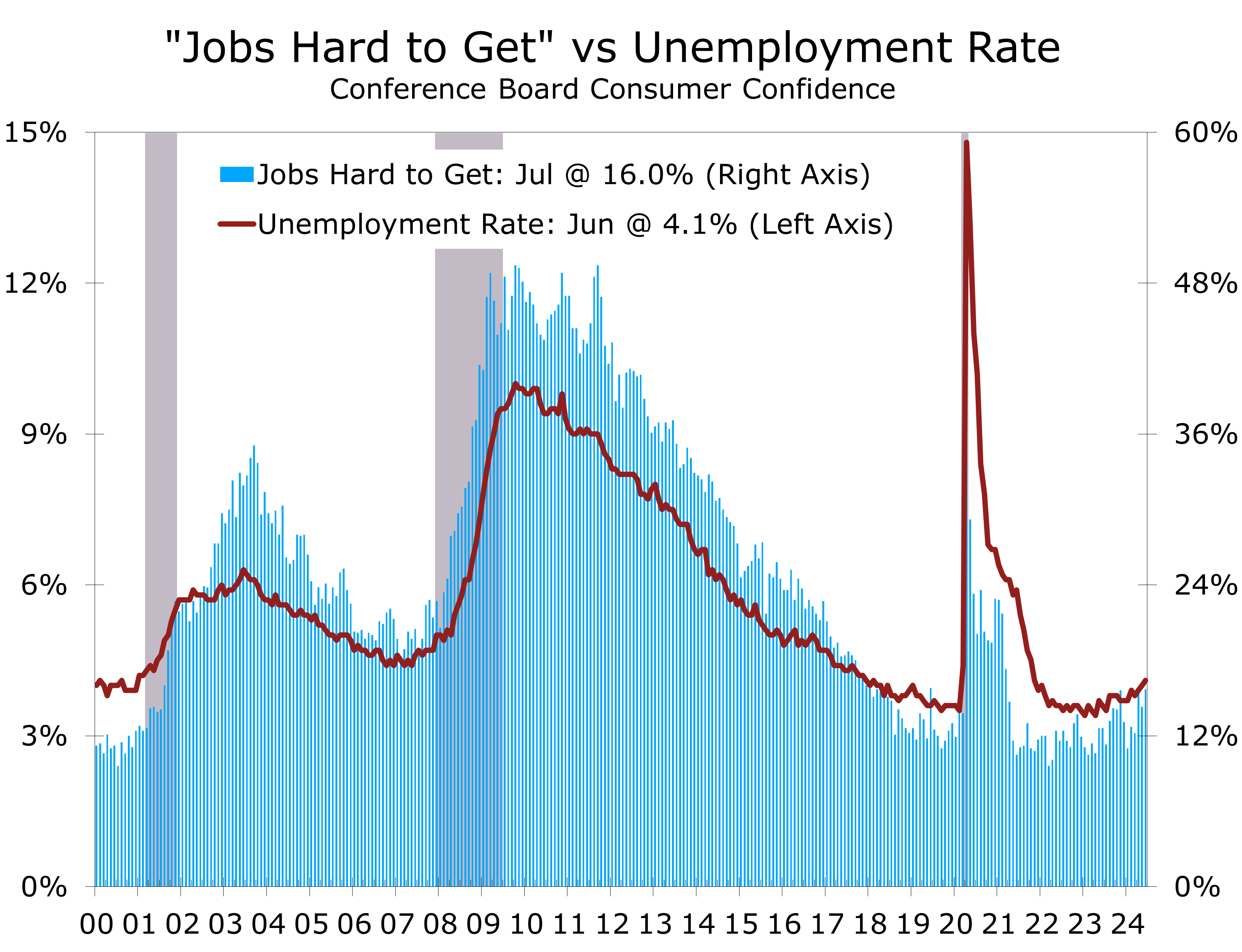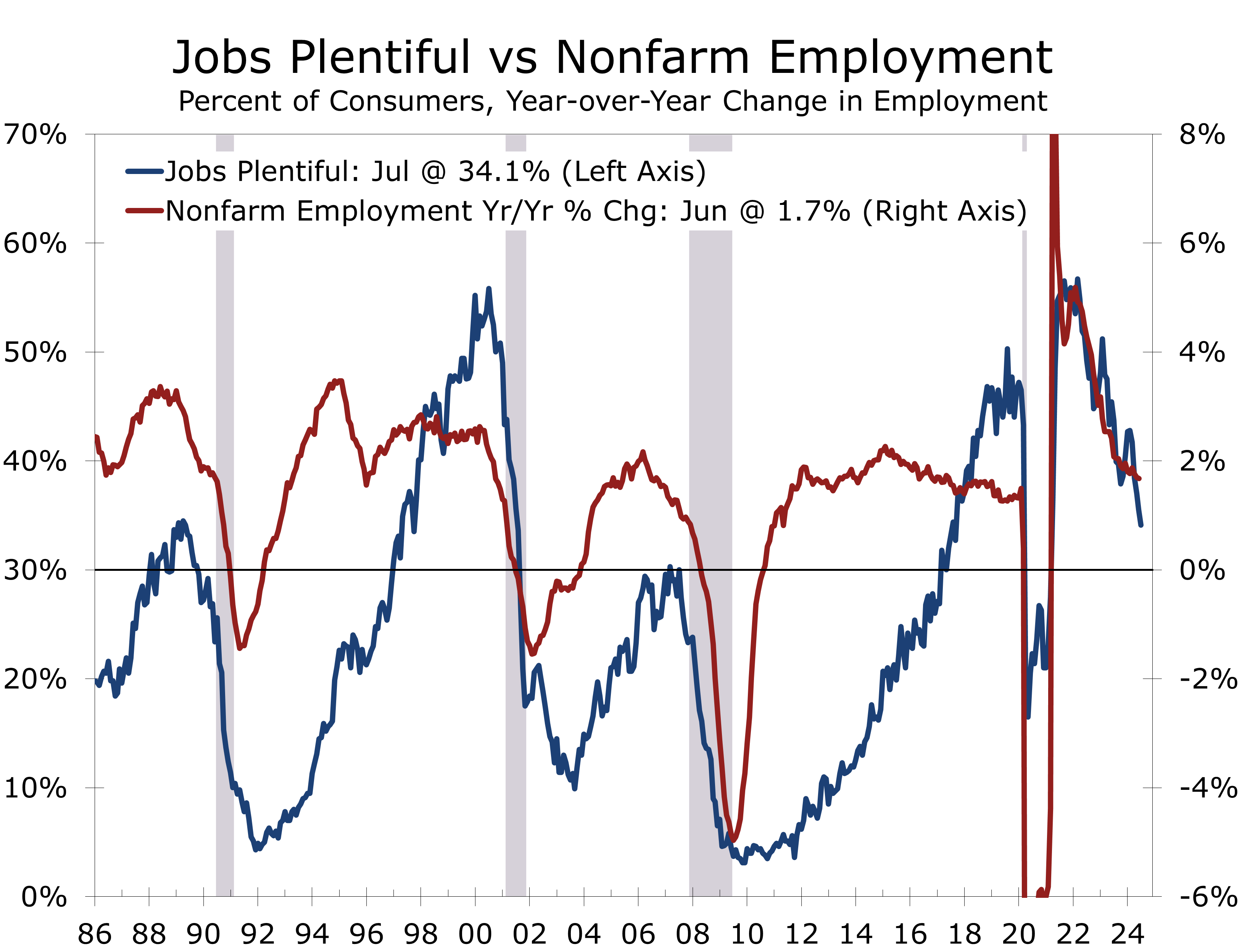- The labor market indicators in the report offered confirm a cooling job market, fewer consumers see jobs as “plentiful” while more say jobs are “hard to get.”