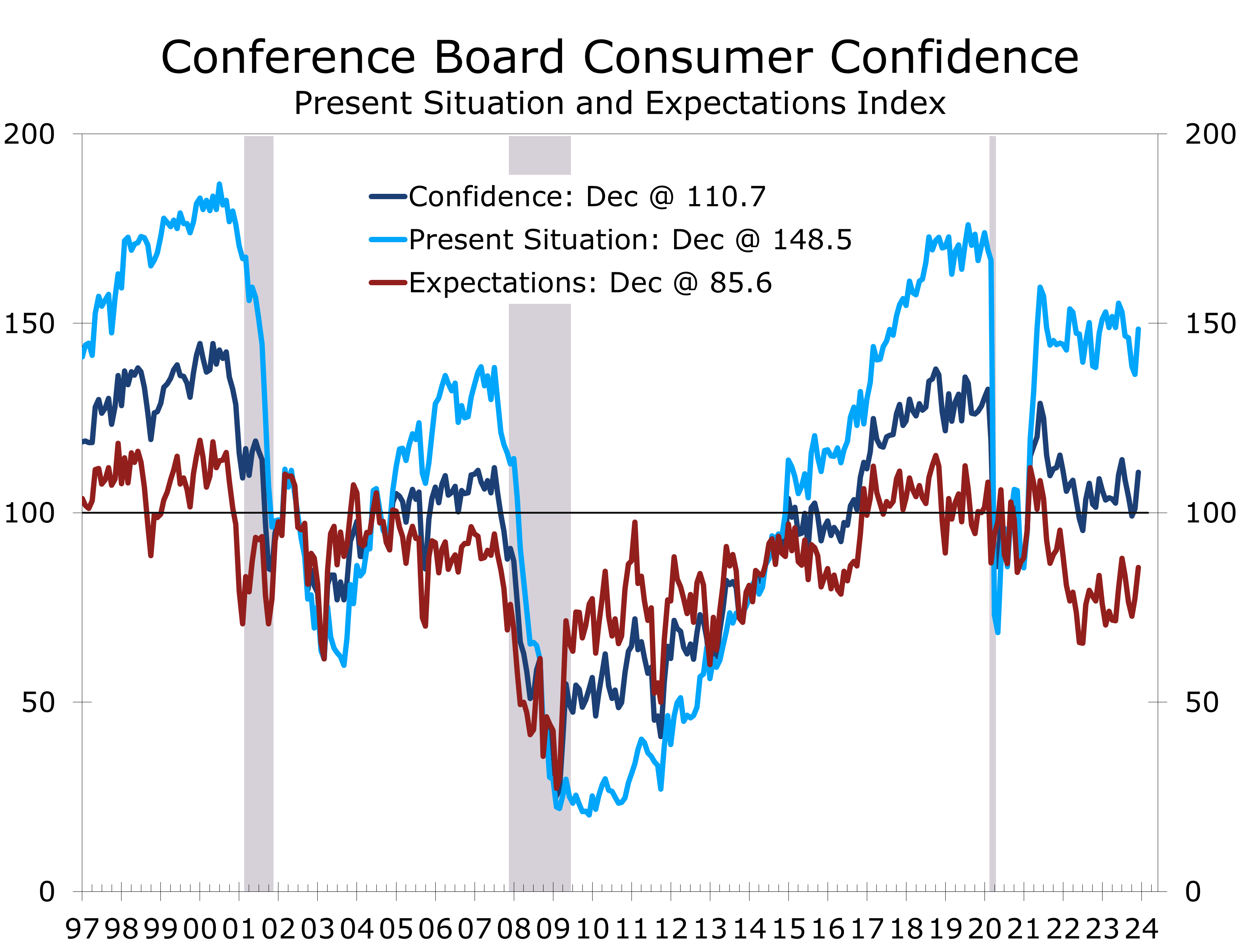 • Present conditions rose 12 points to 148.5, while expectations rose by 8.2 points to 85.6. Both hit their highest levels since July.